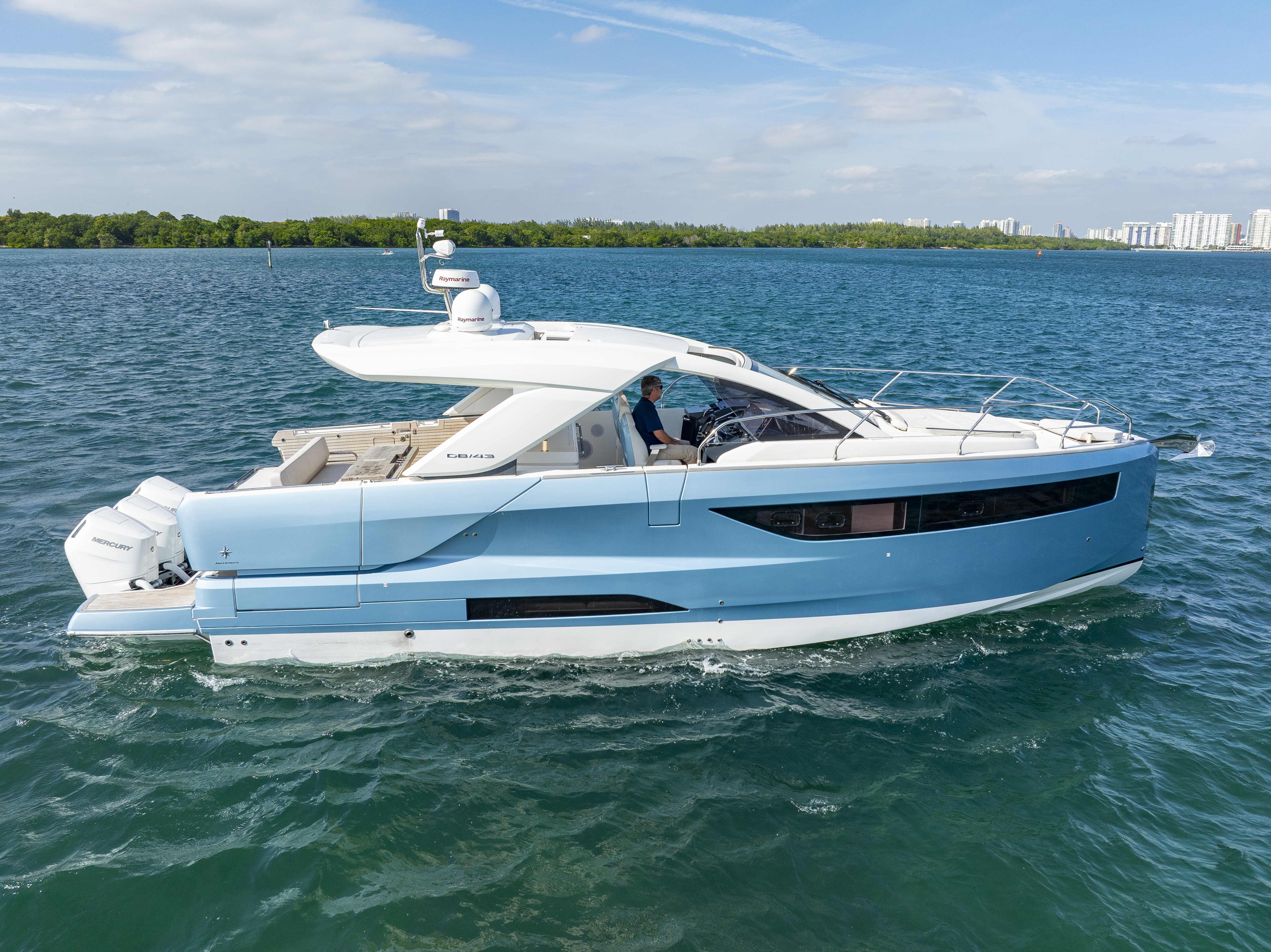The 2024 Jeanneau DB43 is a masterpiece of contemporary European yacht design, blending sophisticated styling, cutting-edge engineering, and luxurious comfort. Built for both spirited performance and refined leisure, this premium day boat offers the perfect combination of power, elegance, and versatility. Powered by triple 350hp Mercury Verado outboards, she delivers an exhilarating yet smooth ride—effortlessly slicing through open waters or gliding along the Miami coastline and The Bahamas with precision and stability. At 45 feet in length, the DB43 maximizes every inch of space for comfort and social enjoyment. Her open layout invites seamless flow between the cockpit, salon, and beach club terraces, while the electric drop-down side platforms expand the deck for easy access to the water. The foredeck features a large sunpad perfect for relaxation at anchor, and the aft cockpit can be configured for dining, lounging, or water sports. The helm station combines advanced navigation technology with ergonomic design, ensuring a superior experience for both captain and guests. Below deck, the DB43 offers a bright and refined interior with two cabins, a fully equipped galley, and a spacious bathroom—making her ideal for extended day trips or overnight escapes. Equipped with a powerful stabilizer and remarkably seaworthy, the Jeanneau DB43 redefines the modern luxury day boat. She is the ultimate choice for exploring Miami, the Keys, or the Bahamas in pure comfort and style. Suggested Itinerary: Your adventure aboard begins here. Get ready to experience the perfect blend of excitement and serenity on the waters of Biscayne Bay. Whether your mood is for adventure, relaxation, or both, this yacht offers an unforgettable day at sea. Morning: Begin your journey with a smooth, high-speed cruise across Biscayne Bay. Admire the vibrant Miami skyline and the stunning waterfront estates of Star Island as you enjoy the power and elegance of the DB43. Midday: Anchor at a quiet sandbar to swim or snorkel in the crystal-clear water, or explore the scenic mangroves and islands nearby. Thanks to her shallow draft and hydraulic terraces, the DB43 can access serene coves and beaches larger yachts can’t reach. Afternoon: Cruise towards Haulover Sandbar or the iconic Stiltsville houses for a lively and social atmosphere. With ample deck space and water toys available, it’s the perfect time to enjoy water sports, sunbathing, or simply relaxing on the floating mat. Evening: Head back toward the city as the sun sets over the Miami skyline. The DB43’s expansive aft deck is the ideal setting for cocktails, music, and panoramic views as you end your day in unforgettable style. Details Up to 13 guests (to comply with regulations) 2 bedrooms / 1 bathroom Captain (gratuity paid separately) Cooler, ice, sodas, and water Premium Bluetooth sound system Large floating mat Check the calendar before finalizing your booking