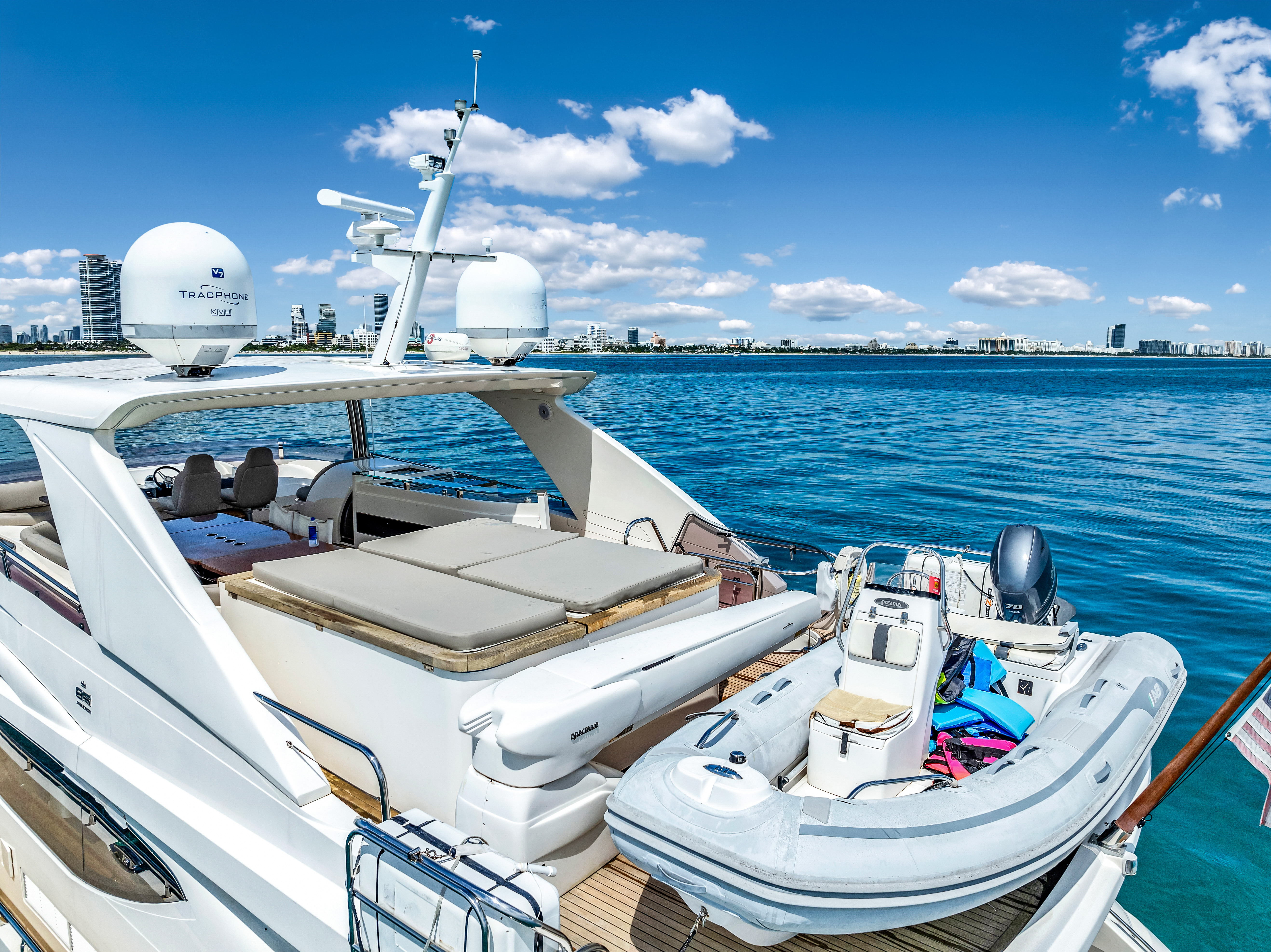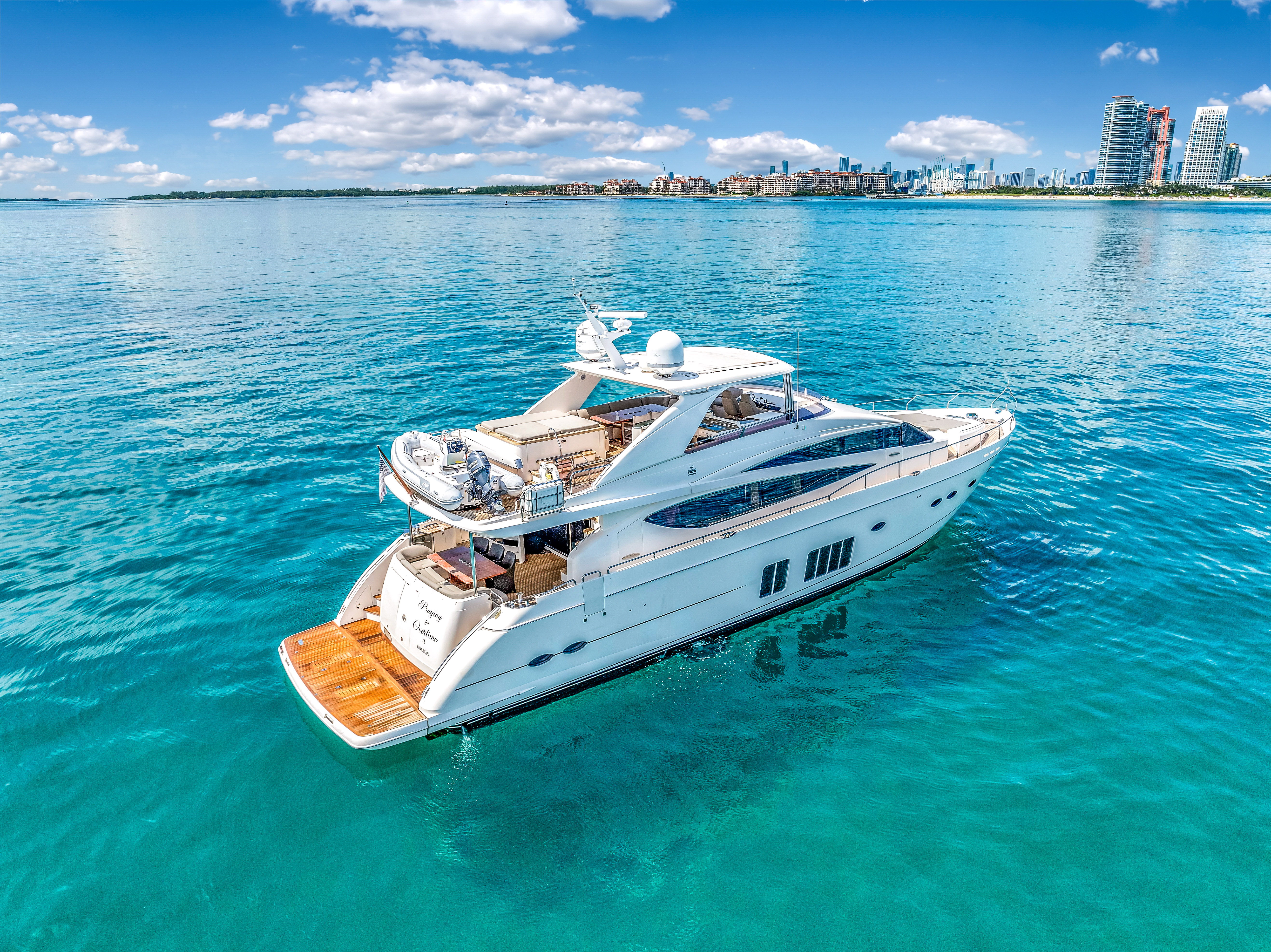 The 88ft Princess with Jacuzzi is the ideal choice for those who want to enjoy a luxurious and relaxing day on the water with the comfort of top-tier amenities. With sleek styling, expansive decks, elegant interiors, and a private Jacuzzi, this yacht is built for unforgettable moments whether you are celebrating a special occasion or simply enjoying the Miami sunshine Suggested itinerary: Departing from Miami Beach Marina, this charter offers quick access to the most iconic cruising grounds in Biscayne Bay Morning: Start your day with a scenic cruise past Star Island, Fisher Island, and the shores of South Beach. Relax on the flybridge or bow lounge while enjoying a fresh breeze and morning refreshments Midday: Anchor near the deeper waters off Virginia Key or just south of Key Biscayne. Go for a swim, float on a mat, or simply unwind on the aft deck with music and light bites. The Jacuzzi is a perfect mid-day retreat with stunning bay views Afternoon Continue cruising through Biscayne Bay along the Biscayne Channel or toward the calm areas near the Cape Florida Lighthouse. Whether you choose to relax on the sunbeds or enjoy a gourmet lunch onboard, the Princess provides a refined and comfortable setting Evening: As the sun sets, cruise back toward the city with the skyline gradually lighting up around you. Sip cocktails in the Jacuzzi or lounge on the upper deck with your guests as golden hour transitions into a glowing Miami night Details: Up to 13 guests to comply with regulations 4 bedrooms / 3 bathrooms Jacuzzi, Float Mat, Paddle Boards Bluetooth Sound System Includes Captain, 3 Stewardesses, Water, Sodas, Ice, Towels Includes minimum gratuity to the crew Check the calendar before you finalize your booking
