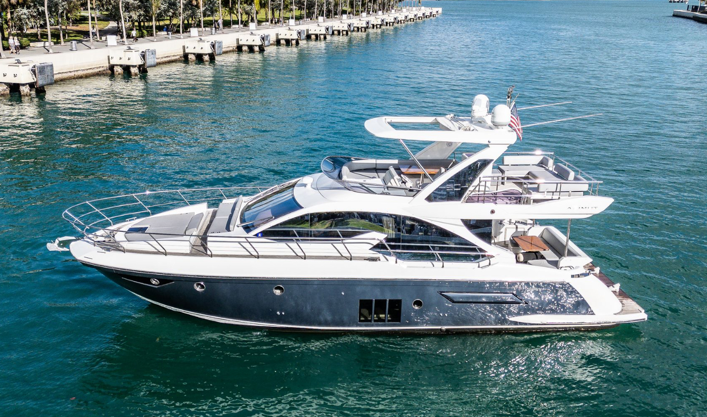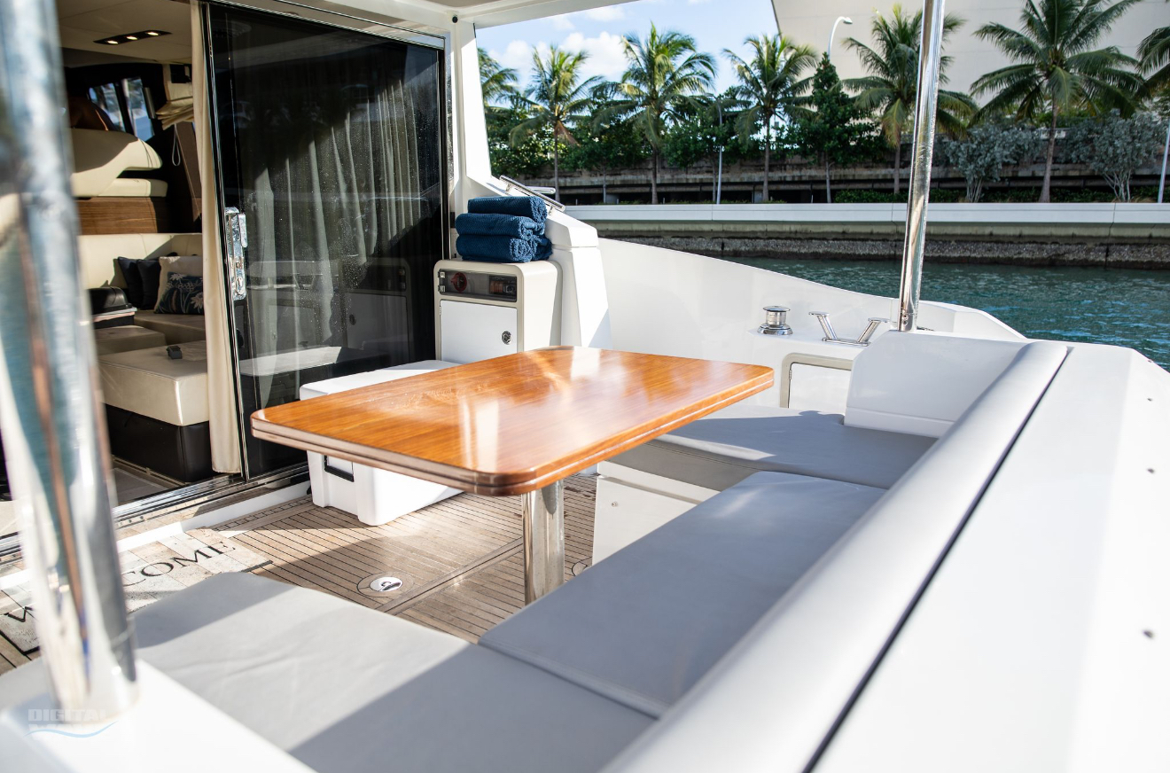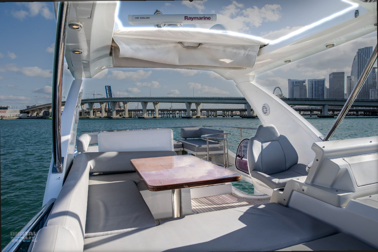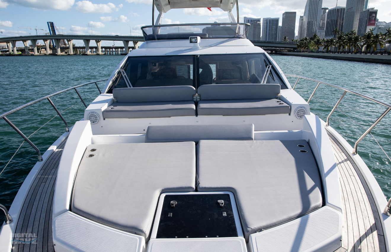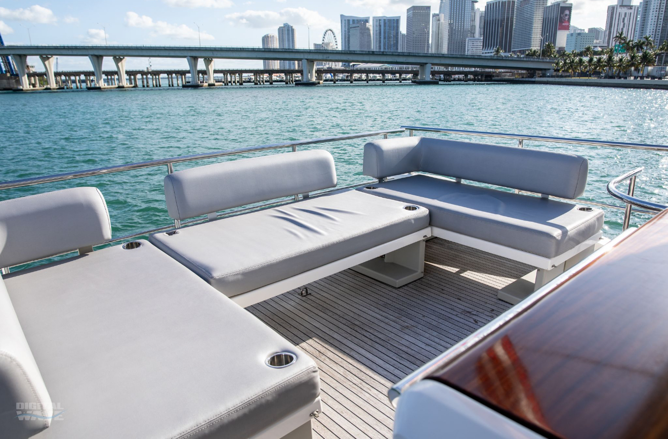 Valentine is the pinnacle of Italian Luxury and gives you the Mega Yacht experience in an affordable size. You and your guests will love the huge living space with the additional fly bridge and aft deck. The bow “front” of the boat is well padded and offers plenty of space for all your guests to comfortably enjoy the ride. On the stern “back” of the boat, the low platform makes is very easy to get in and out of the water. Upstairs, the “Lido Deck” provides a beautiful 360˚ view and plenty seating for 13. As mentioned, the Bow (front of the boat) has plenty of space for lounging, sitting, dancing or just hanging out. Play your favorite music with bluetooth on our professional grade JL Audio system.