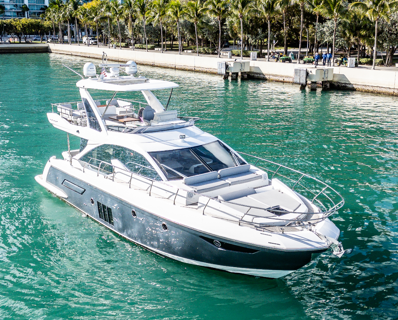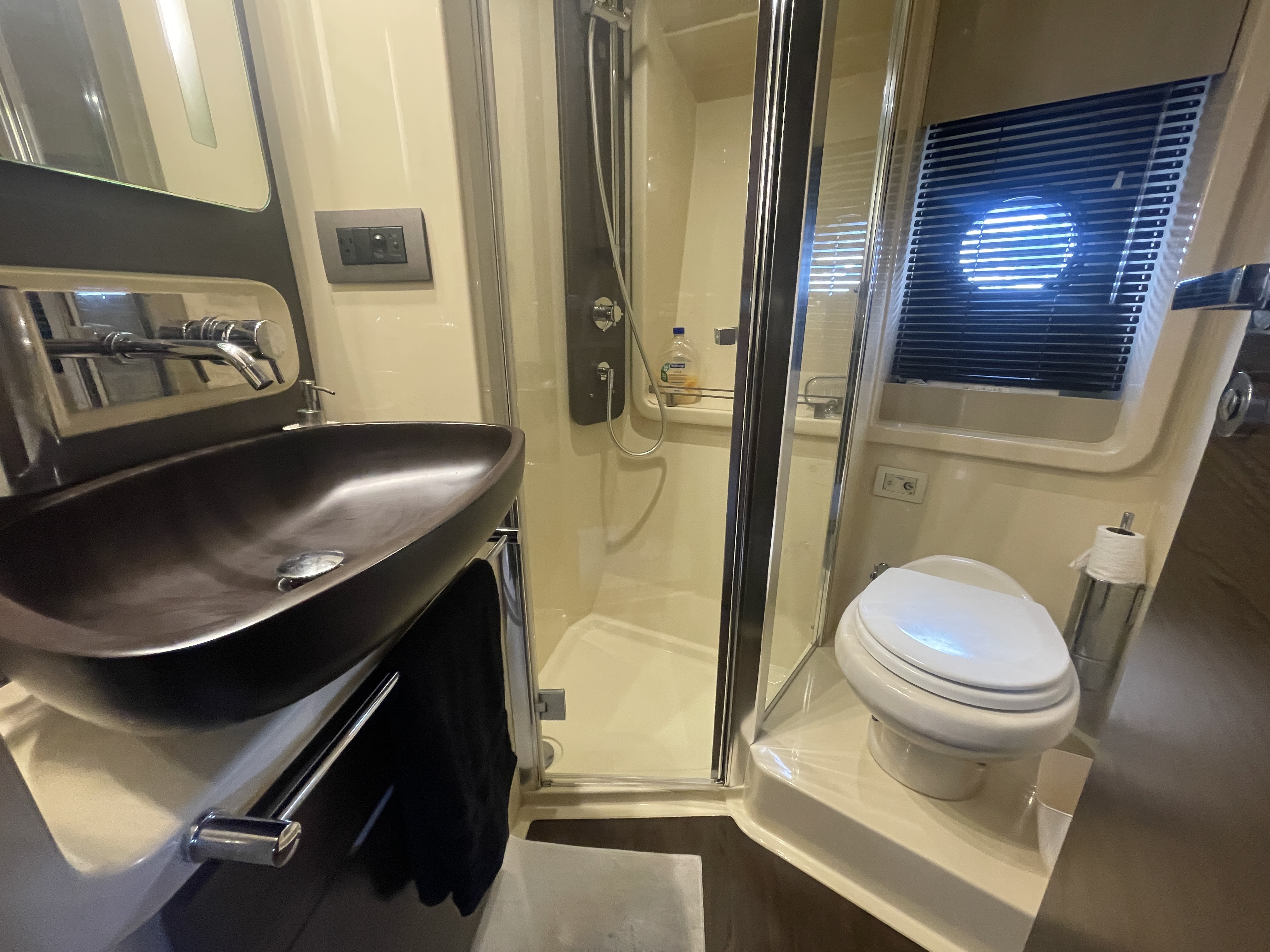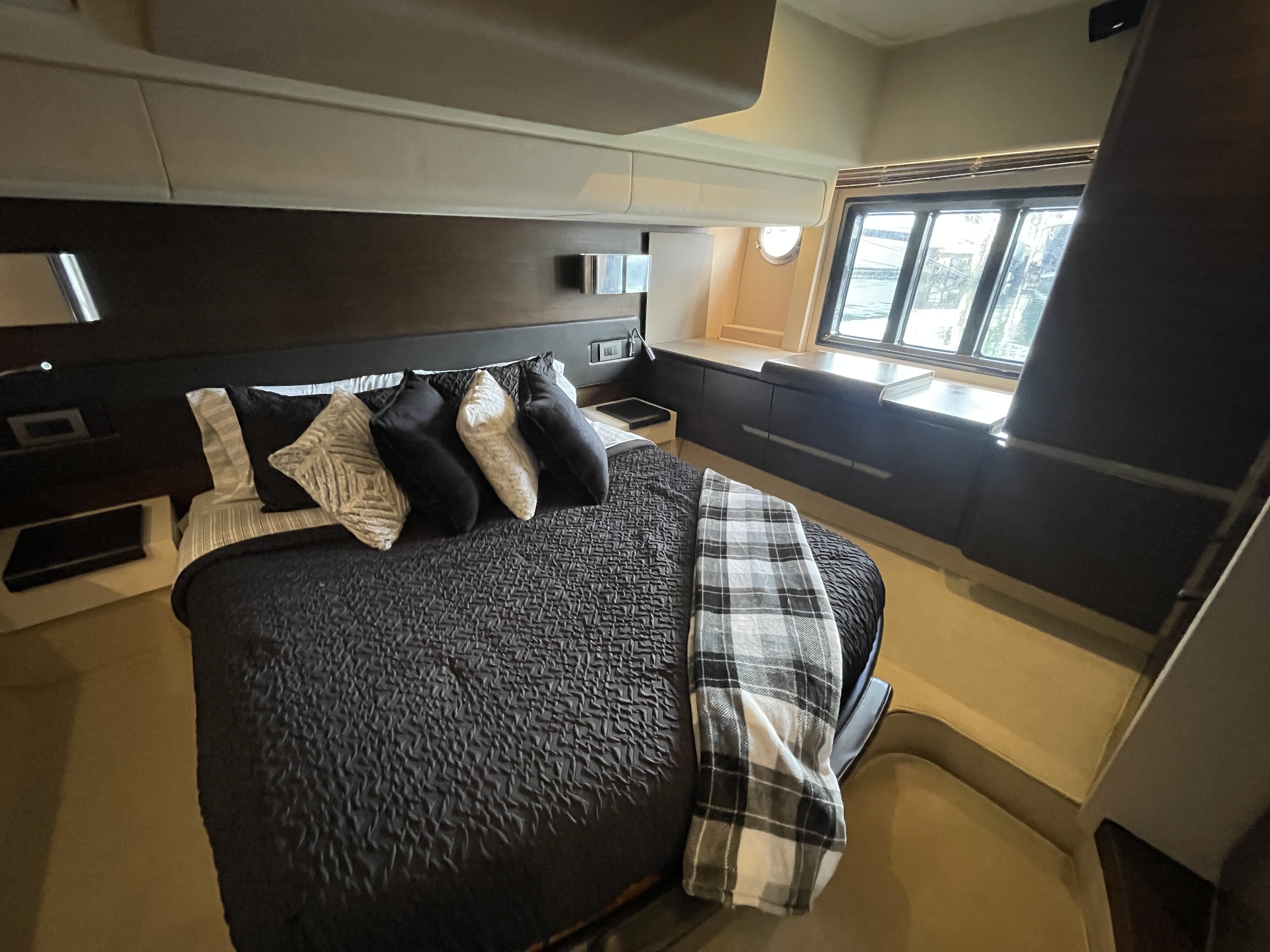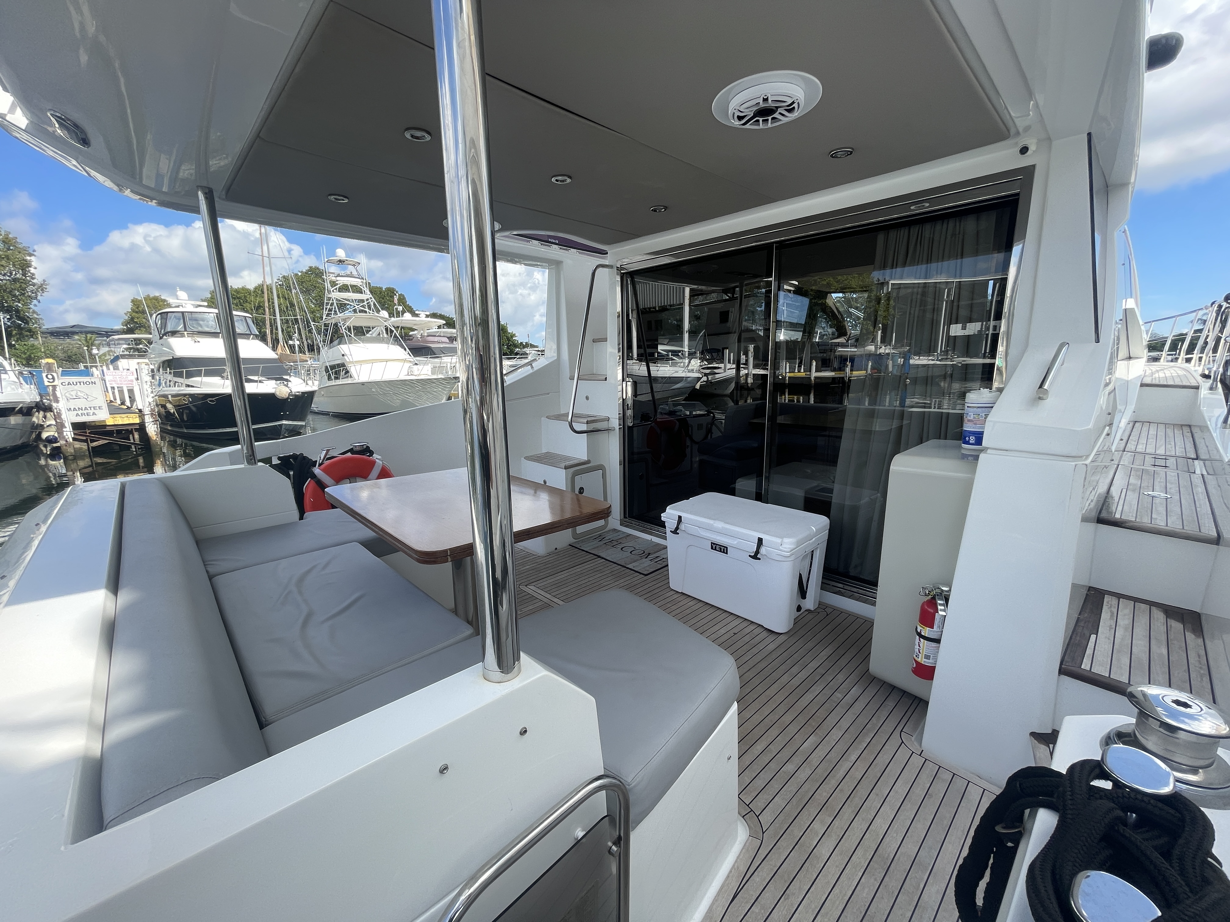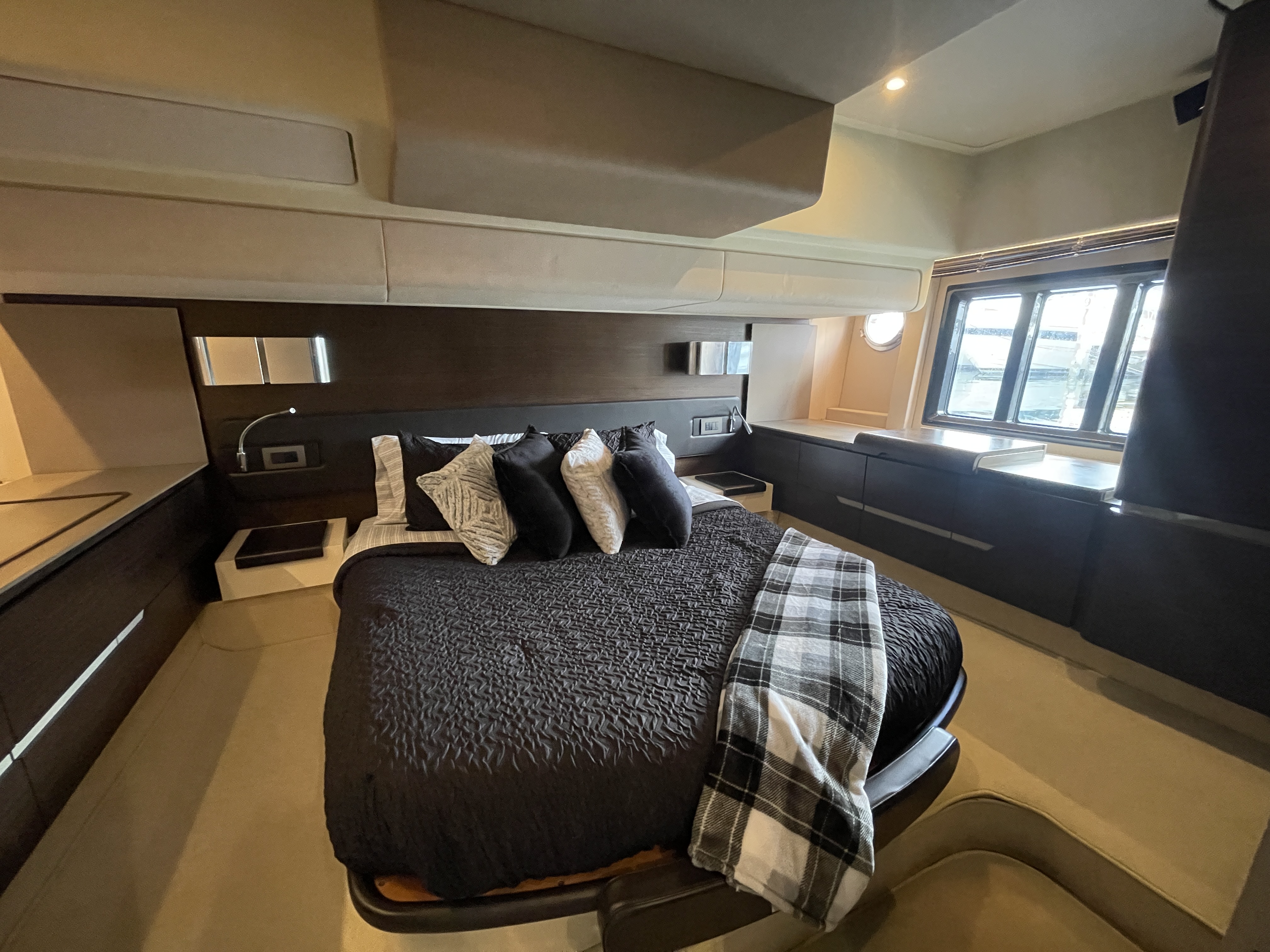 Valentine is the pinnacle of Italian Luxury and gives you the Mega Yacht experience in an affordable size. You and your guests will love the huge living space with the additional fly bridge and aft deck. The bow “front” of the boat is well padded and offers plenty of space for all your guests to comfortably enjoy the ride. On the stern “back” of the boat, the low platform makes is very easy to get in and out of the water. Upstairs, the “Lido Deck” provides a beautiful 360˚ view and plenty seating for 13. As mentioned, the Bow (front of the boat) has plenty of space for lounging, sitting, dancing or just hanging out. Play your favorite music with bluetooth on our professional grade JL Audio system.