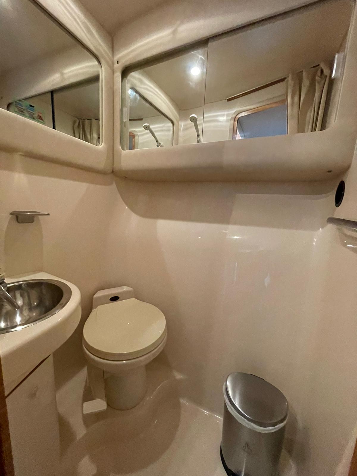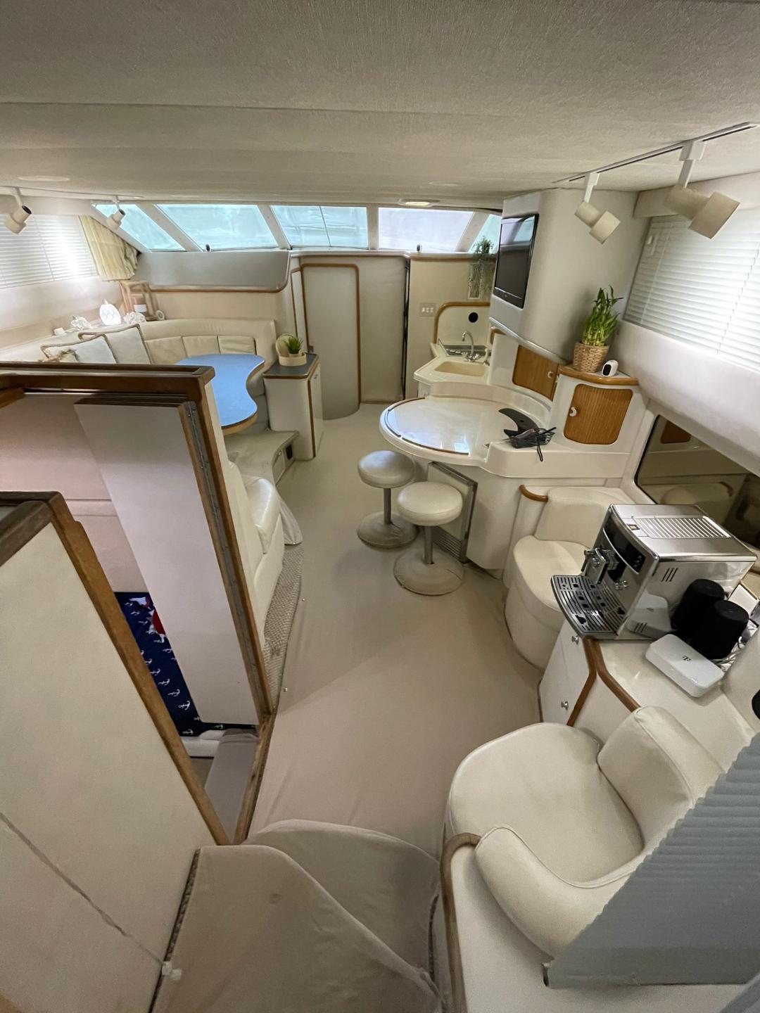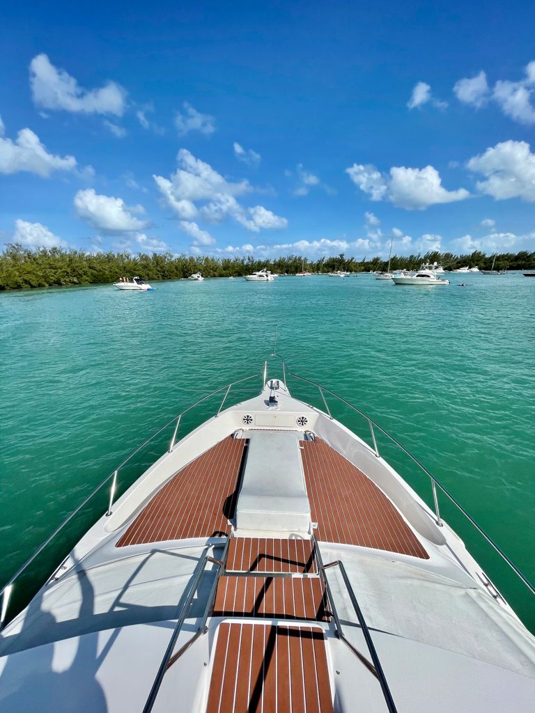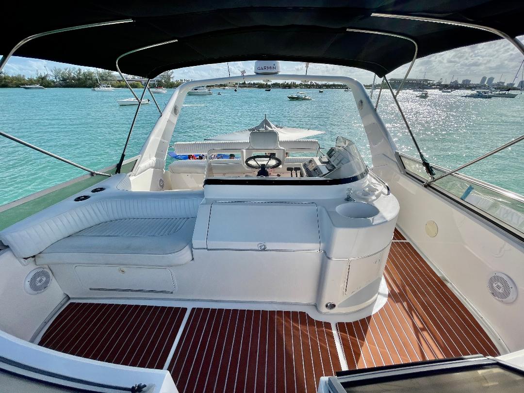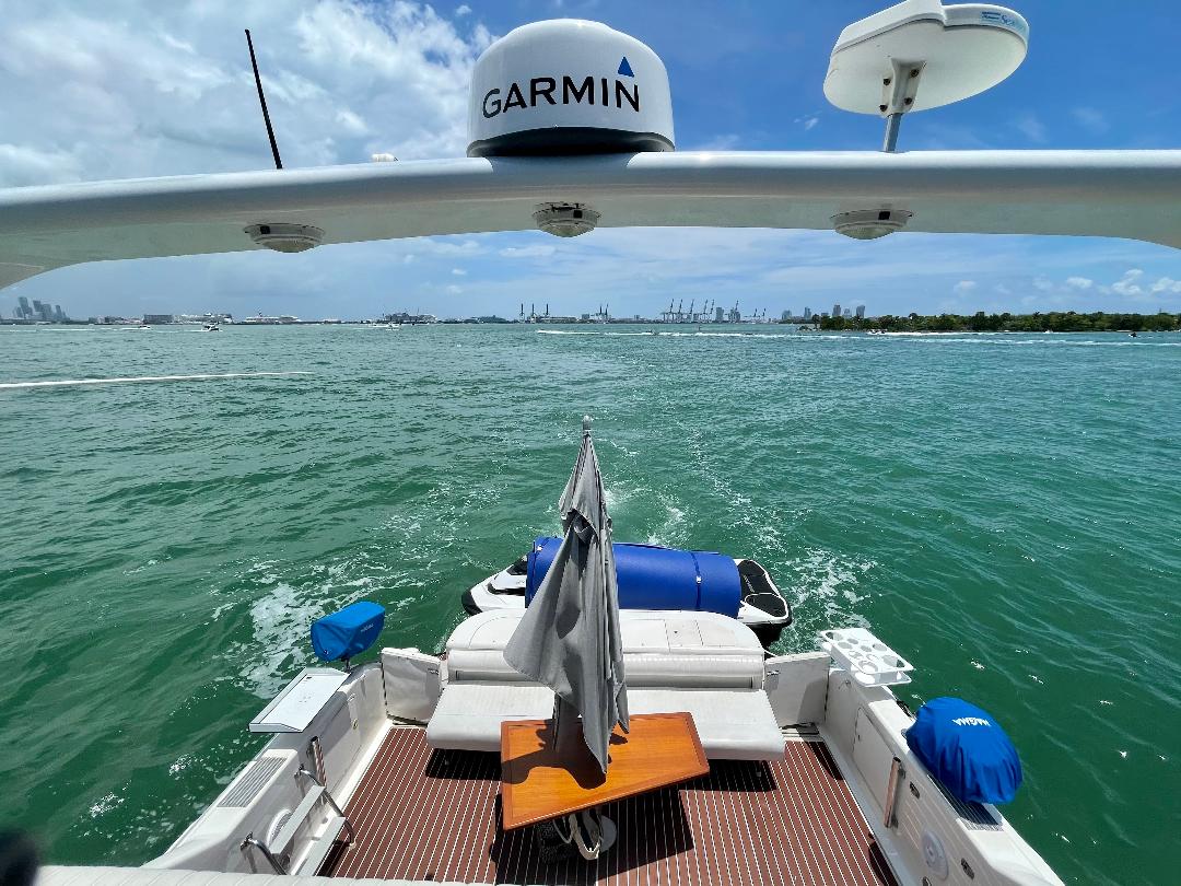 Our spacious pleasure yacht offers multiple environments to fully enjoy your time including a front sundeck area perfect for sunbathing or just taking in the aquatic scenery, an upper deck bridge area for a birds eye view of Miami and the surrounding islands, a spacious aft area complete with mahogany table and umbrella perfect for a light snack or full course meal, a large hydraulic swim platform perfect for lounging in the water or taking a dip in the ocean, and a spacious main cabin area with brand new air conditioning complete with a full kitchen, 2 dining areas, living area, bedroom, and bathroom.