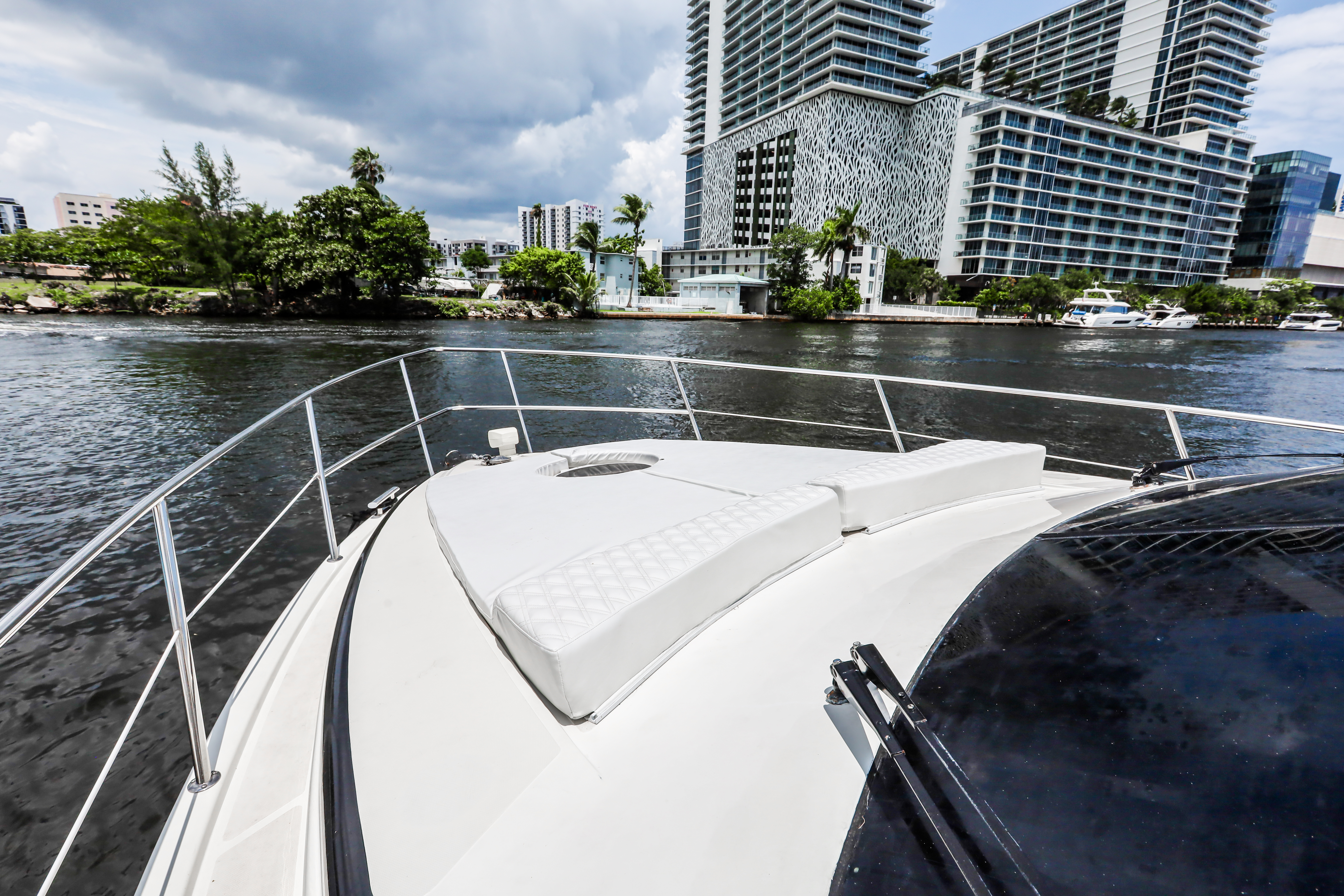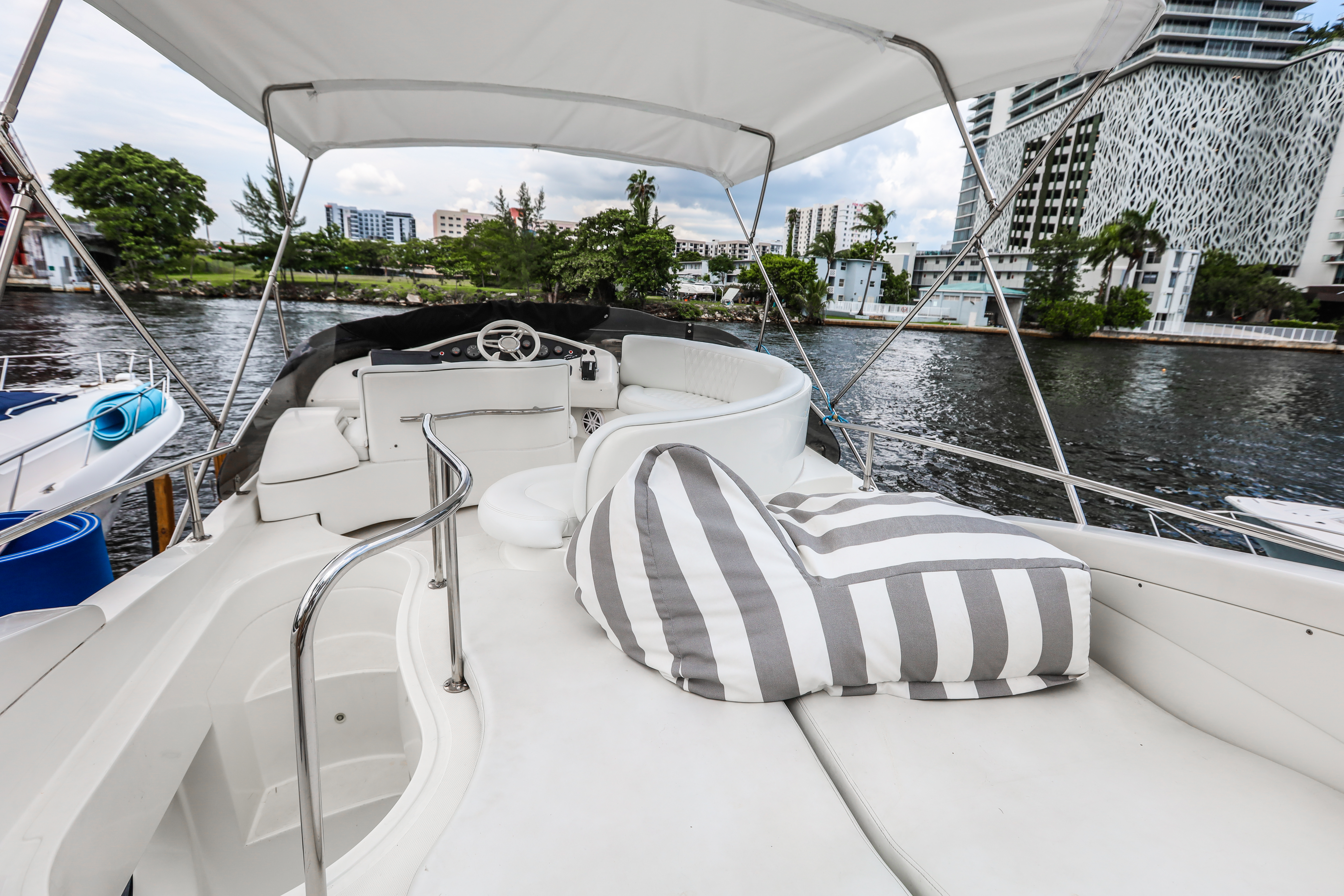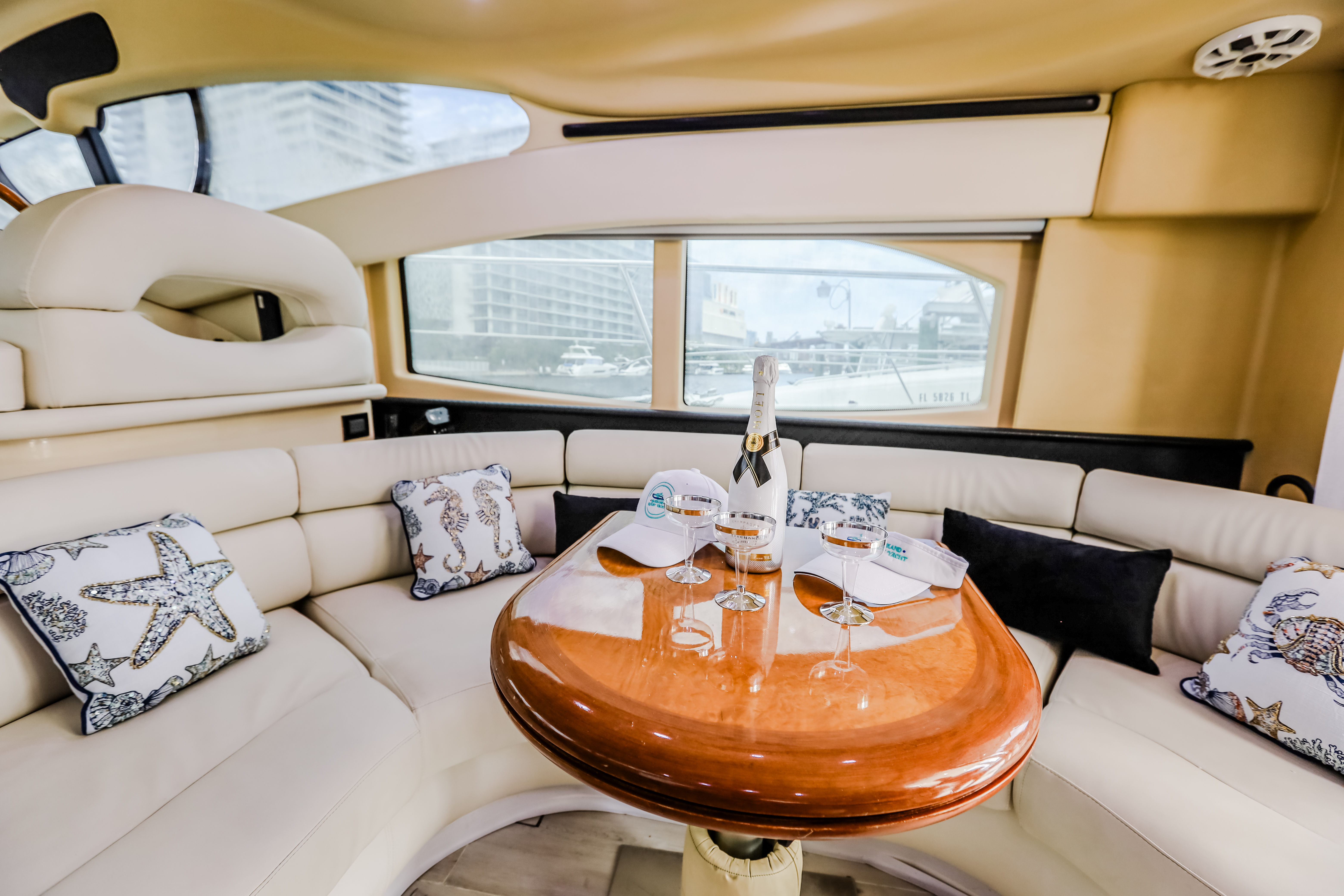 Capacity 13 people Max. Includes: Captain, Mate, Fuel in Miami area, Taxes, Cooler with ice and bottles of water. Plates, cups and utensils. Clean Towels, floating mat or floating jacuzzi. Bluetooth sound system, Party lights and Fog system for night time charters. Gratuity is not included in the price! Weather: The charter may be canceled due to dangerous winds or thunderstorms, as determined by the captain. However, rain alone is not a valid reason for canceling the charter. We will work with you depending on the weather. Notes: No hookahs, no red wine. Please arrive on time, if you arrive late you will lose that time.