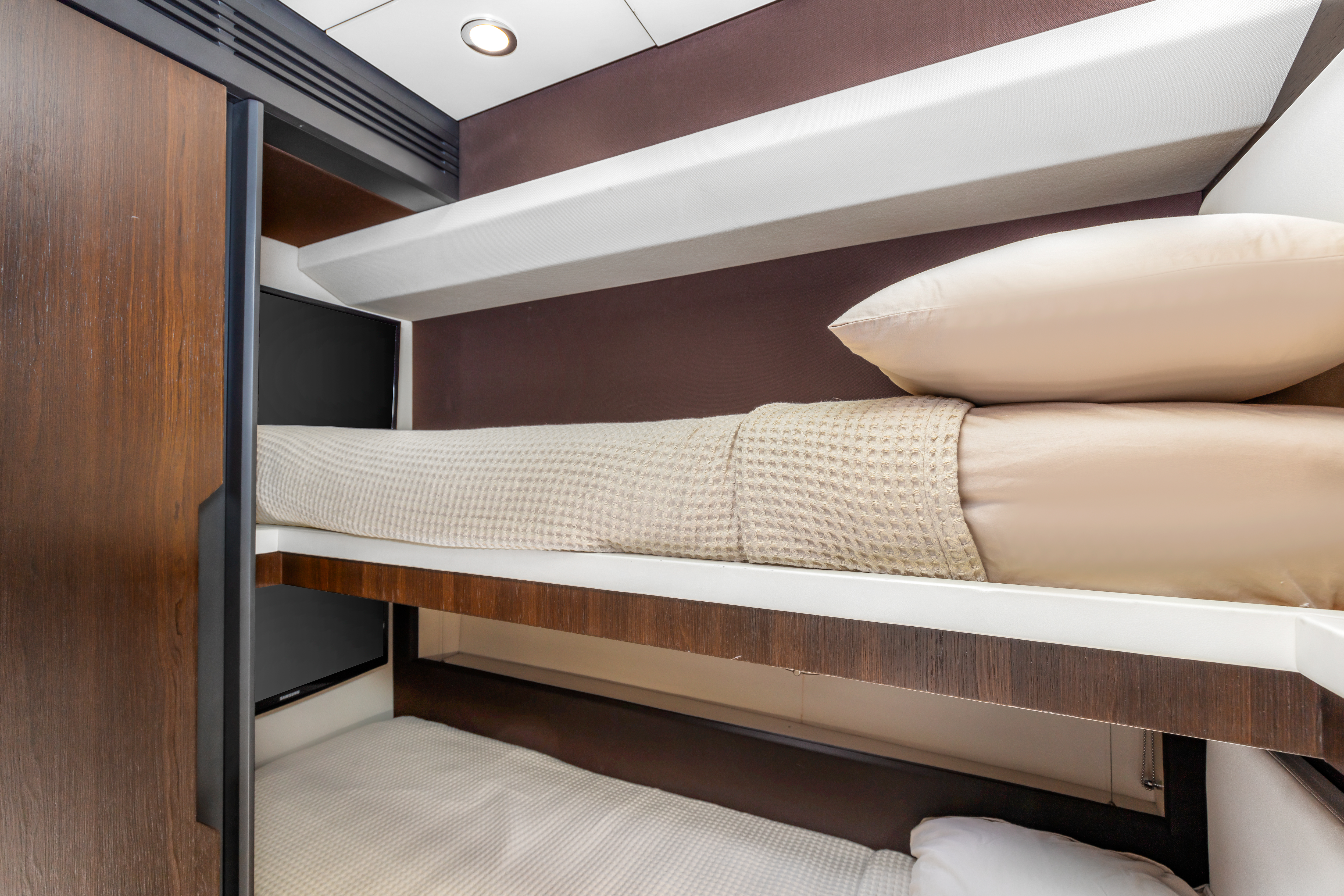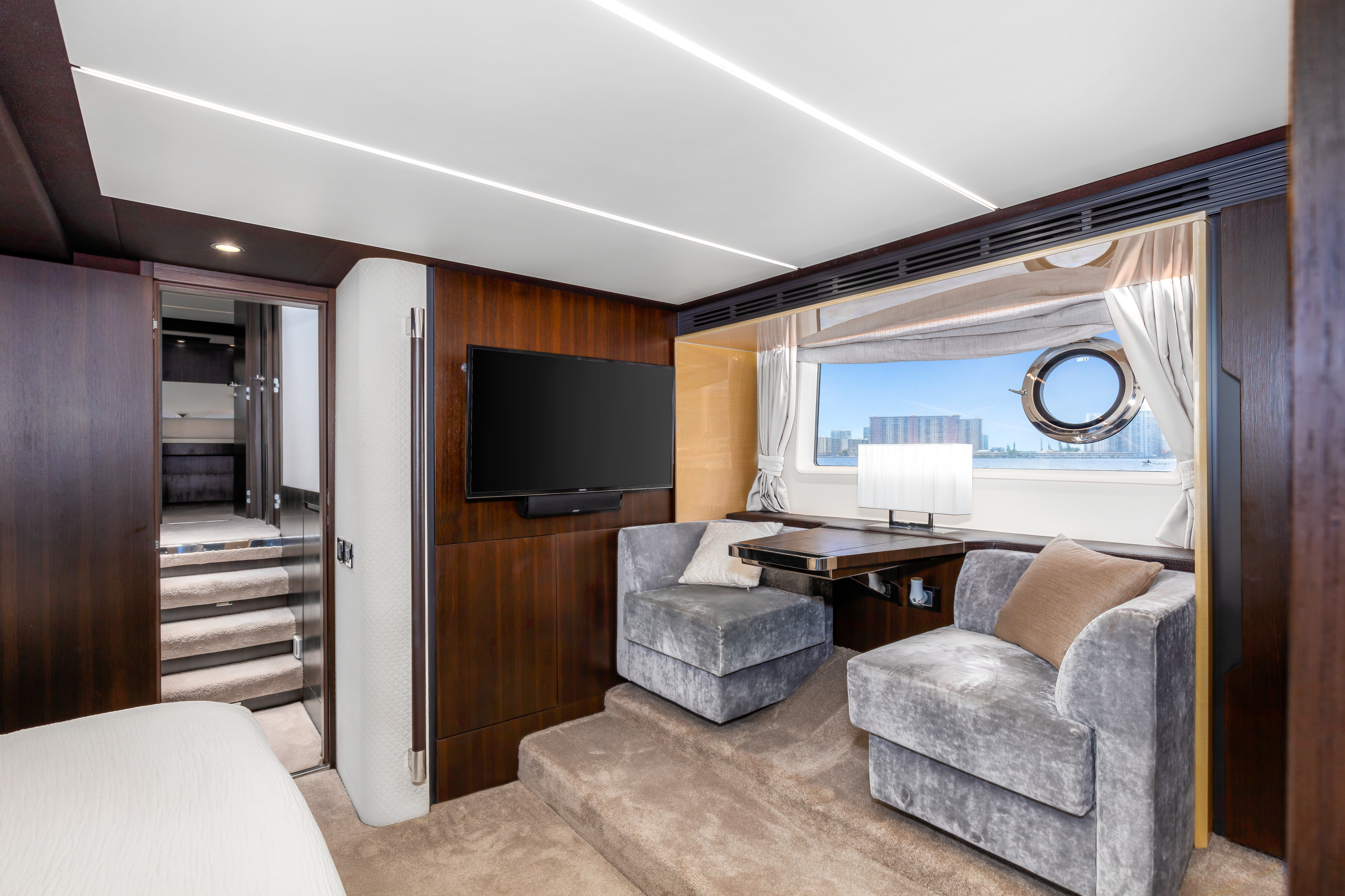 Her expansive flybridge is a true highlight, offering a helm station, wet bar, al fresco dining, and multiple lounging areas with sweeping views, ideal for entertaining or relaxing under the sun. The aft deck provides seamless indoor-outdoor living, while the bow lounge features oversized sunpads for ultimate comfort at sea.