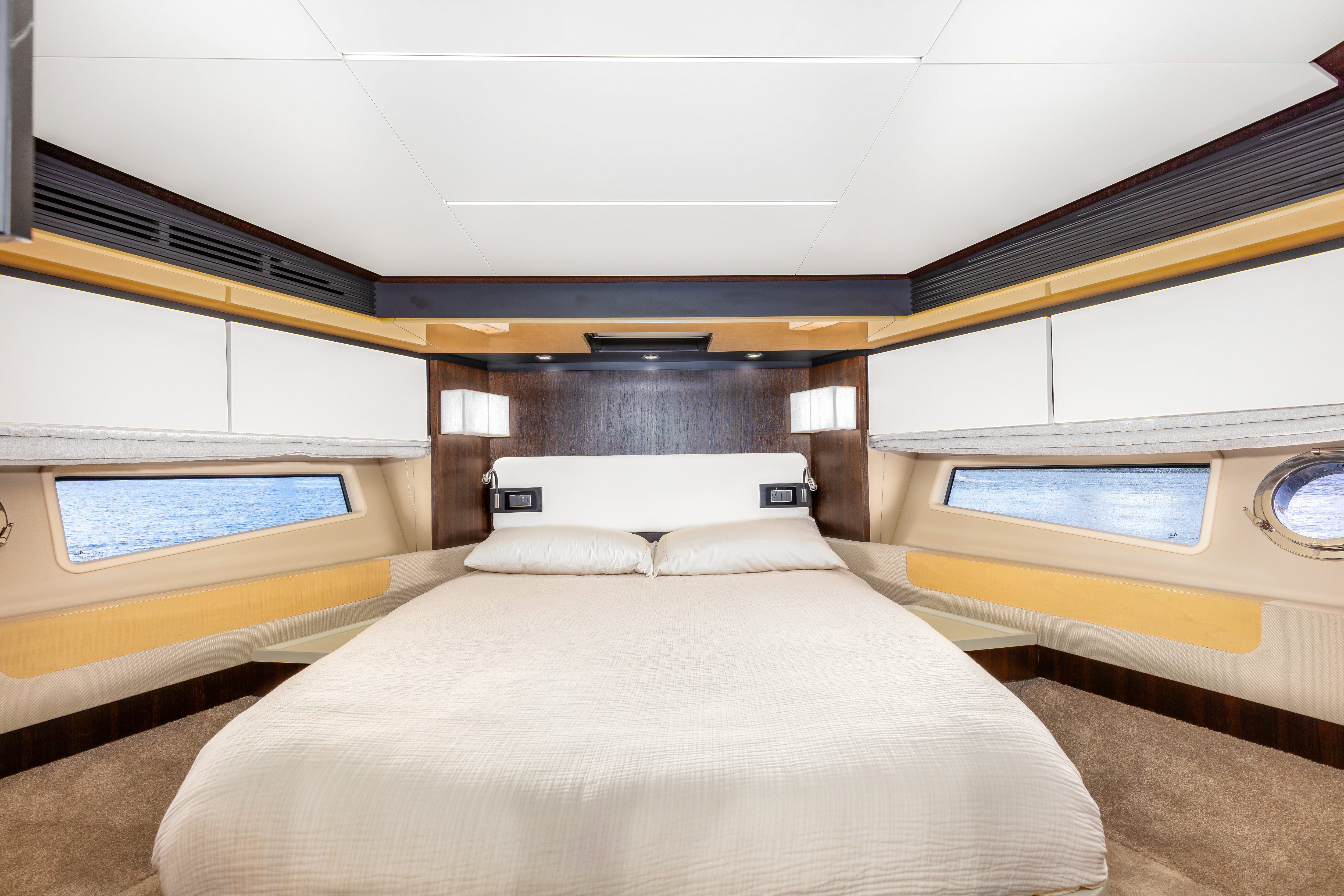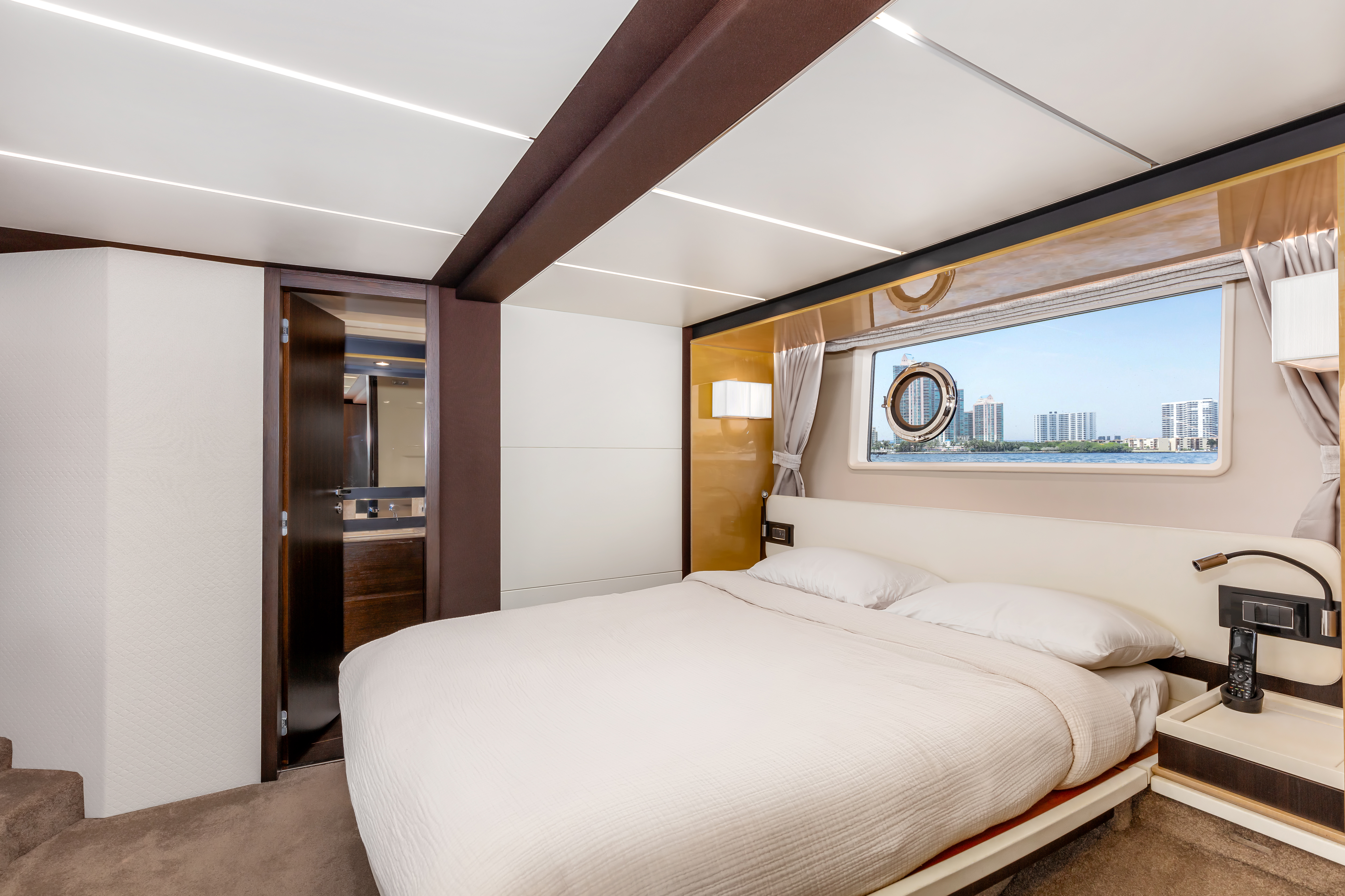Inside, the yacht showcases Azimut’s signature contemporary style, with a bright salon, elegant dining space, and a fully equipped galley. Large windows flood the interior with natural light, creating an airy and inviting atmosphere. Below deck, she offers 4 luxurious staterooms, including a full-beam master suite with ensuite bathroom, providing privacy and comfort for overnight guests.