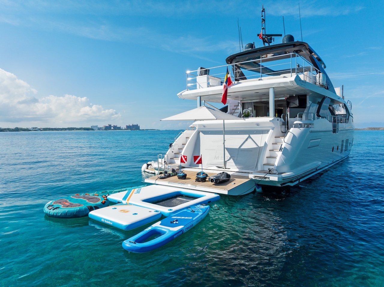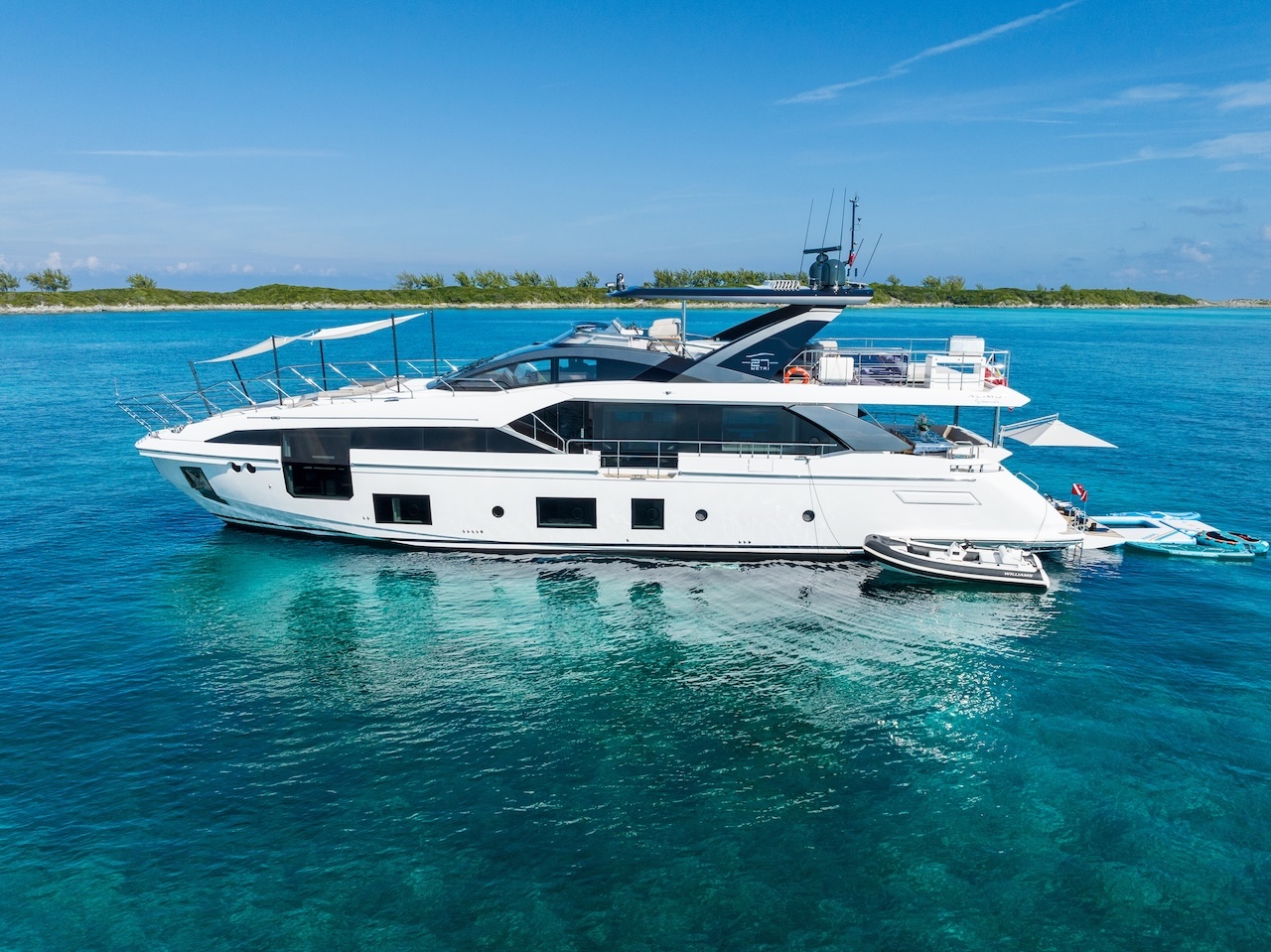 The 2023 Azimut Grande 27 Metri is an 88ft masterpiece of Italian design, innovation, and elegance. Part of Azimut’s flagship Grande Collection, she offers superyacht volume and style within a sleek, contemporary profile. Powered by twin MAN engines, the Grande 27 Metri delivers powerful performance and smooth cruising, making her equally at home along the Miami coastline, in the Keys, or on extended voyages to the Bahamas. Her expansive exterior decks are designed for both relaxation and entertainment. The flybridge is a true social hub, featuring a helm station, wet bar, al fresco dining, and multiple lounge areas with unobstructed views. The aft deck flows seamlessly into the salon, while the bow offers an additional lounge and sunpad area, creating multiple outdoor spaces for guests to enjoy. Inside, the yacht’s interiors, designed by Achille Salvagni, reflect modern Italian sophistication with open spaces, rich textures, and custom furnishings. Floor-to-ceiling windows flood the salon with natural light, creating a bright and airy atmosphere. Below deck, she accommodates up to 8 guests in 5 luxurious staterooms, including a full-beam master suite, each with ensuite bathrooms for ultimate comfort and privacy. To elevate the charter experience, the yacht comes with a large floating platform fully equipped with water toys, including jet skis, sea bobs, paddleboards, and snorkeling gear — creating endless opportunities for fun on the water. With her cutting-edge design, spacious layout, and extensive amenities, the 2023 Azimut Grande 27 Metri sets a new standard in luxury yachting; the perfect choice for those seeking an exclusive Miami or Bahamas charter experience at the highest level. Suggested itinerary: Departing from Island Gardens Marina, this charter offers effortless access to the best of Biscayne Bay and the deeper cruising grounds around Miami. Morning: Begin your day with a smooth cruise past the iconic homes of Star Island and Fisher Island. Take in the views of the Miami skyline and South Beach while relaxing on the flybridge or bow lounge. Midday: Anchor off the coast of Virginia Key or near the entrance of Key Biscayne. Enjoy a refreshing swim or float on the water mat, with easy access from the yacht’s large swim platform. This is the perfect time to enjoy drinks or a light lunch onboard. Afternoon: Continue cruising through the open waters of Biscayne Bay. Explore scenic spots like the Biscayne Channel or the peaceful shoreline of Cape Florida. The yacht’s stability and layout create a perfect atmosphere for both relaxation and entertaining. Evening: Return toward the city as the sun begins to set. Watch the skyline illuminate from the comfort of the aft deck or flybridge while sipping cocktails and enjoying hors d’oeuvres. Whether you are celebrating or simply unwinding, the Azimut 27M offers an unforgettable way to close out the day. Details: Up to 13 guests to comply with regulations 5 bedrooms / 5 bathrooms Jetski, Seabob, 2 Paddle boards, Snorkeling equipment, Big Floating mat Bluetooth Sound System Includes Captain, 2 Stewardesses, Water, Sodas, Ice, Towels Includes Minimum Gratuity to the crew Check the calendar before you finalize your booking Multi-day charters: Need to add APA (advance provisioning allocation)