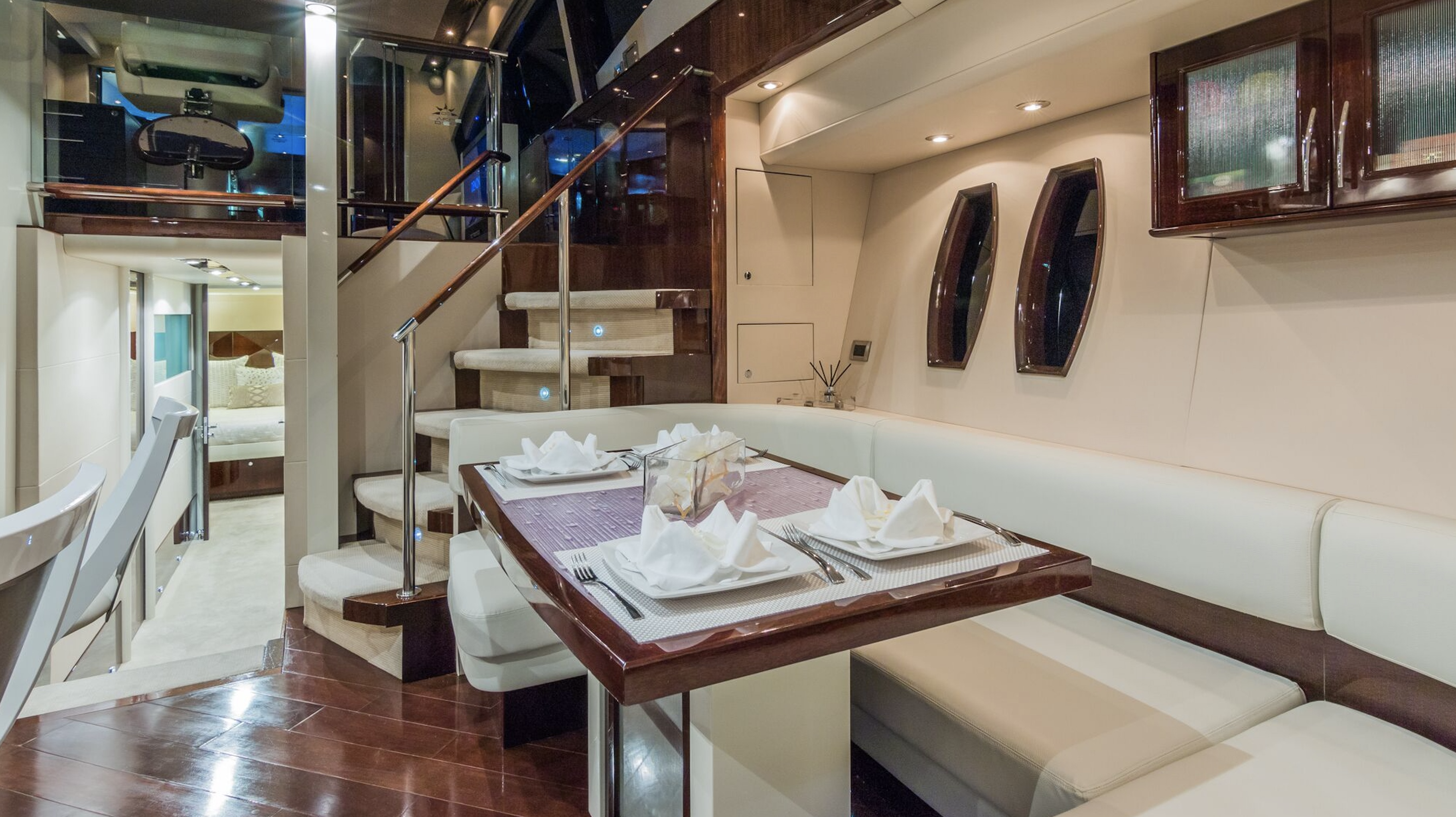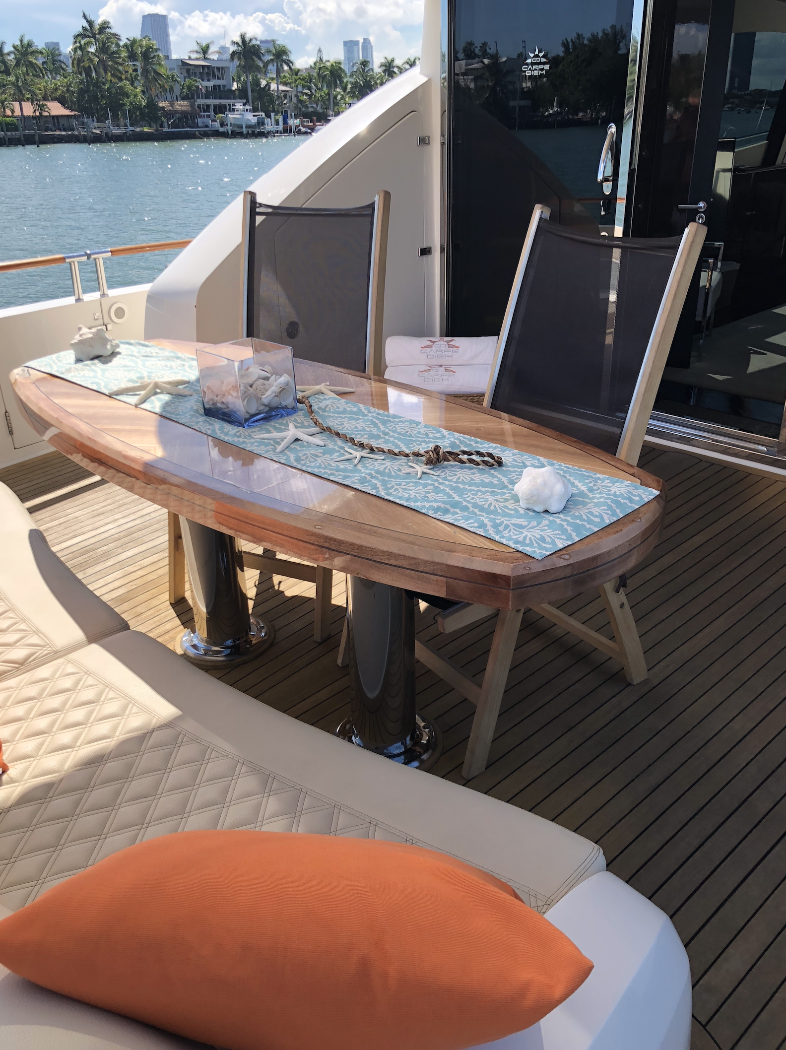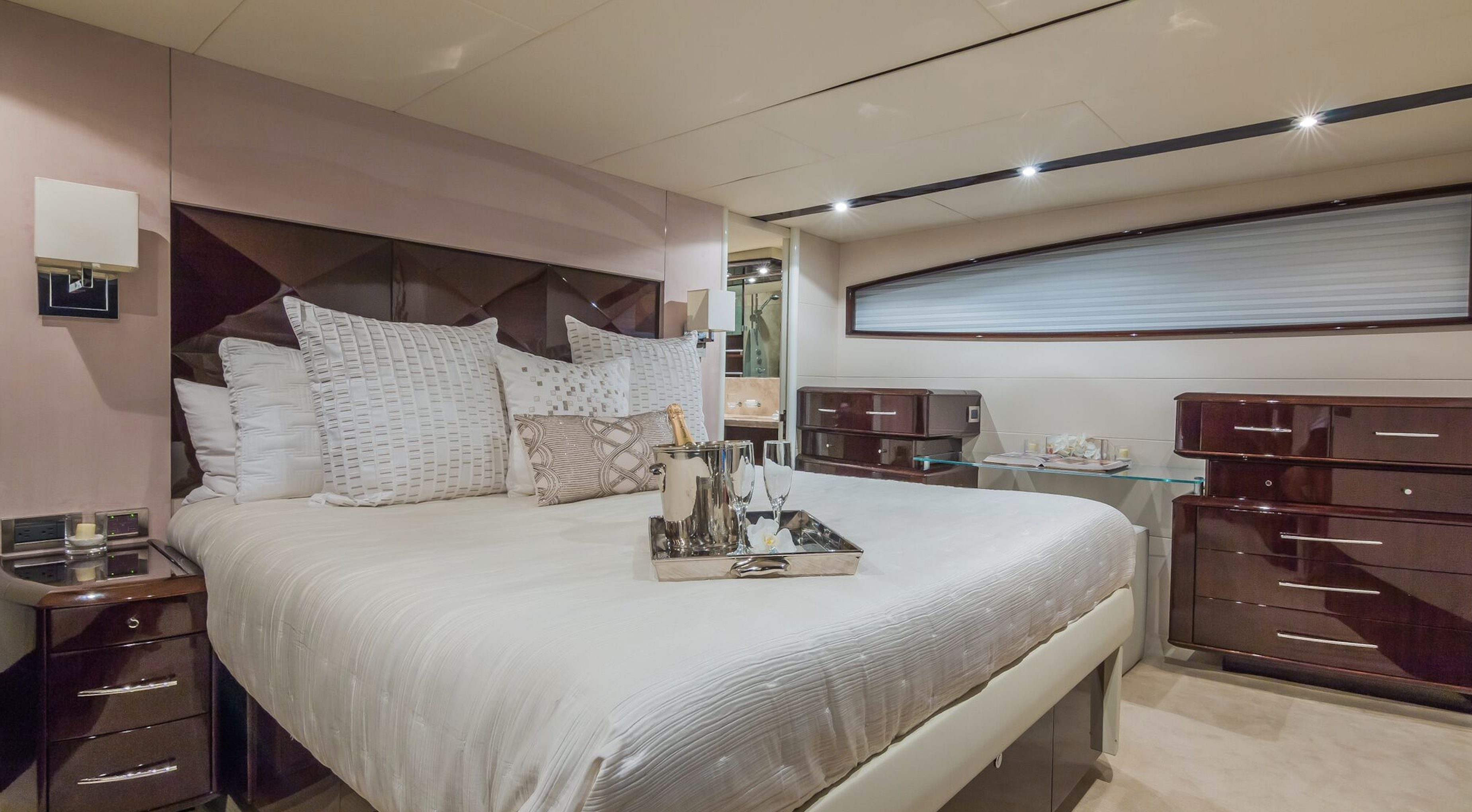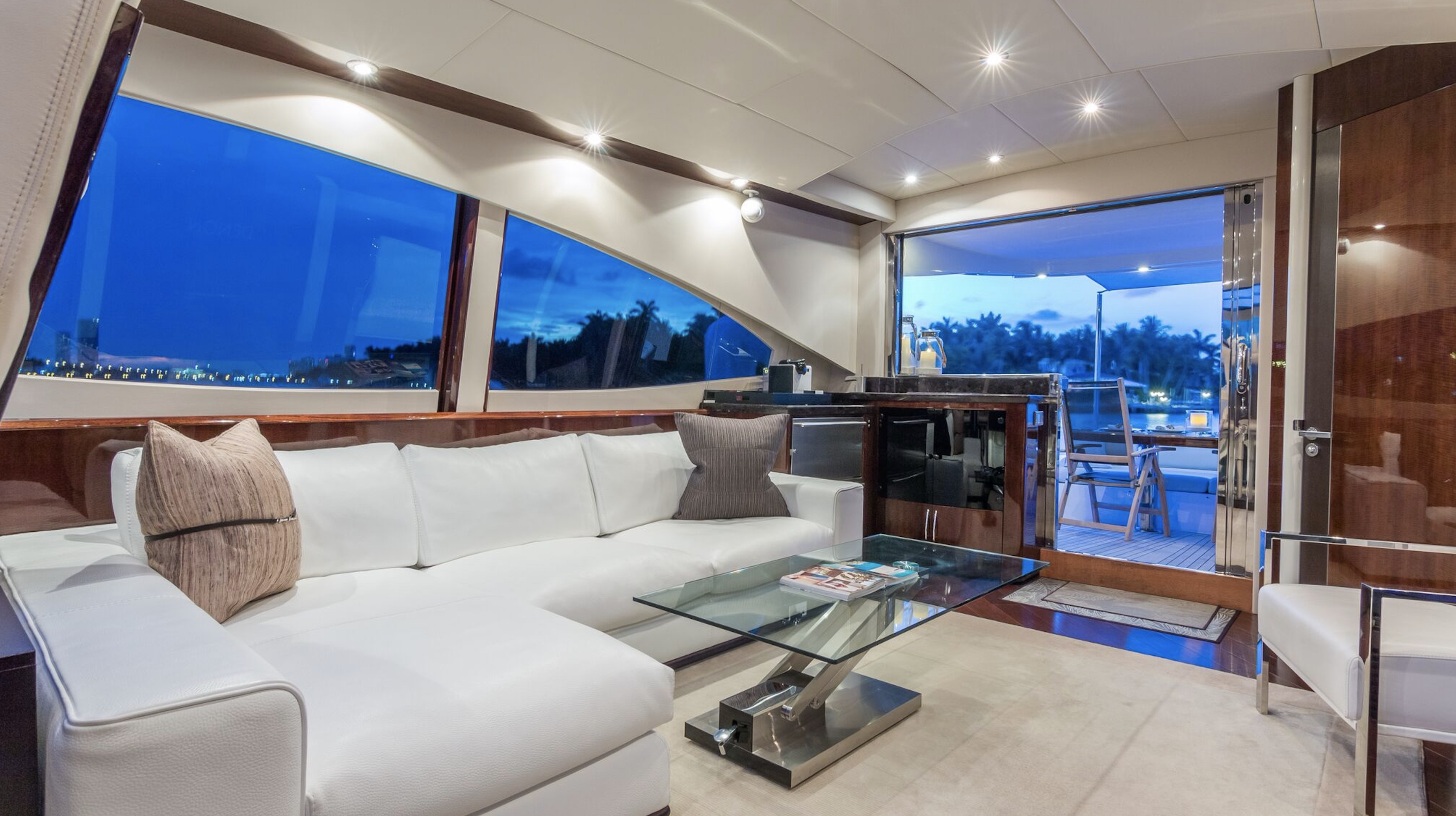 Her exterior spaces are designed for the ultimate Miami lifestyle, featuring an expansive aft deck with a large sunbed, a walk-up bar, and a retractable sunroof in the main salon that brings the outdoors in. The 2025 refit has updated the interiors with elegant, minimalist finishes and state-of-the-art entertainment systems, ensuring every moment on board feels brand new.