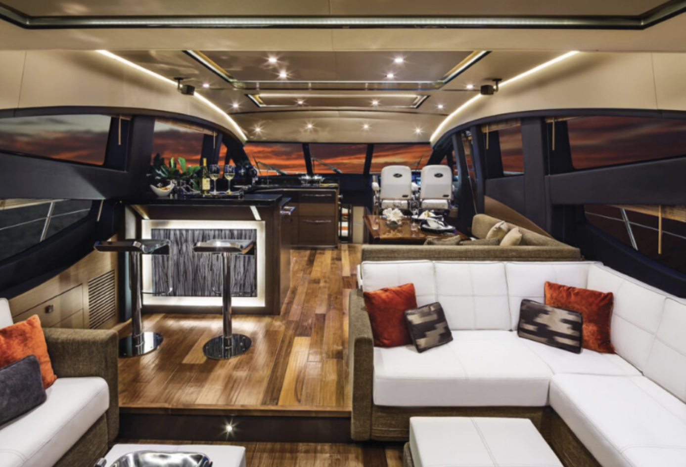 Her exterior spaces are designed for both relaxation and entertainment. The expansive flybridge features a helm station, al fresco dining, a wet bar, and multiple lounging areas with panoramic views. A generous bow lounge provides oversized sunpads, while the aft deck offers seamless access to the salon and a hydraulic swim platform for water activities.