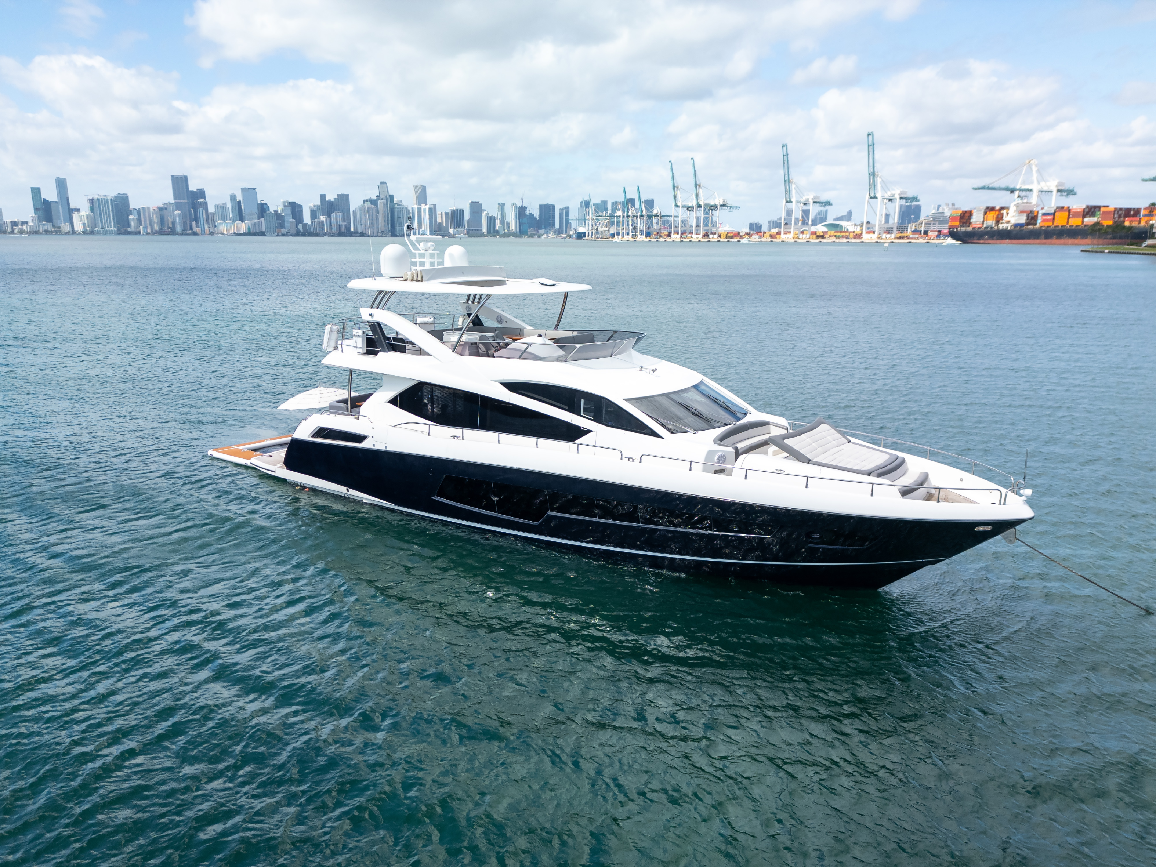 The 2014 Sunseeker 80 Yacht is a striking blend of British craftsmanship, sleek performance, and upscale comfort. Known for Sunseeker’s iconic sporty profile and elegant interior design, this 80-footer delivers a true superyacht experience while remaining agile enough for both day cruising and longer adventures across Florida and the Bahamas. With her generous size, refined materials, and spacious entertainment areas, she is perfectly suited for guests seeking the highest level of comfort on the water. Powered by twin MAN engines, the Sunseeker 80 offers impressive speed, exceptional stability, and smooth handling — ideal for exploring Biscayne Bay, cruising along Miami’s coastline, or embarking on multi-day island escapes. Departing from Miami Beach Marina, you’ll begin your journey right in the heart of South Beach, surrounded by luxury yachts, world-famous views, and direct access to the open ocean. Her expansive flybridge is a standout feature, offering an elevated helm station, sun loungers, large seating areas, a wet bar, and a shaded alfresco dining setup. This space is perfect for entertaining, relaxing under the sun, or enjoying 360° panoramic views of Miami and the surrounding waters. The aft cockpit seamlessly connects to the open and bright salon through wide glass doors, blending indoor and outdoor living with the signature Sunseeker elegance. Below deck, the Sunseeker 80 boasts a 4-cabin layout, including a full-beam master stateroom, a forward VIP suite, and two guest cabins — all designed with premium materials and refined styling. The yacht’s generous volume, wide beam, and thoughtful layout make her ideal for multi-day charters to the Keys, Bimini, or the Exumas. Stylish, powerful, and exceptionally comfortable, the 2014 Sunseeker 80 Yacht offers an elevated luxury yachting experience, perfect for guests looking for a premium day charter or a multi-day escape from Miami Beach. Suggested Itinerary: Your luxury escape begins the moment you depart from Miami Beach Marina, one of the most iconic marinas in South Florida. Morning: Cruise along the South Beach waterfront, passing Fisher Island, Star Island, and the Port of Miami. Enjoy the yacht’s smooth ride and spacious bow sunpads as you take in the city’s glamorous skyline. If you prefer a more relaxed start, settle into the flybridge with a morning coffee and the fresh ocean breeze. Midday: Anchor in the crystal-clear waters of Biscayne Bay or head toward the lively Haulover Sandbar. With multiple entertainment areas and a spacious swim platform, the Sunseeker 80 is ideal for swimming, paddleboarding, snorkeling, or simply lounging while enjoying lunch prepared onboard. Afternoon: Explore the scenic waters around Key Biscayne or venture toward Stiltsville. The yacht’s generous outdoor spaces make it perfect for social gatherings, sunbathing, or enjoying the water toys. Whether you’re relaxing in the shade of the flybridge or soaking up the sun on the bow, every corner offers comfort and elegance. Evening: Cruise back toward Miami Beach as the skyline lights up in the golden sunset. Enjoy drinks and music on the flybridge or aft deck, making the most of the breathtaking views before returning to the marina. Details: Up to 13 guests (to comply with regulations) 4 staterooms / 4 bathrooms / 8 sleeps Captain + Stew/Chef (gratuity paid separately) Cooler, Ice, Sodas, Water & Towels included Bluetooth Sound System 2 Floating mat, 2 Inflatable unicorns, Floating pool Please check the calendar before finalizing your booking Multi-day charters: Need to add APA (advance provisioning allocation)