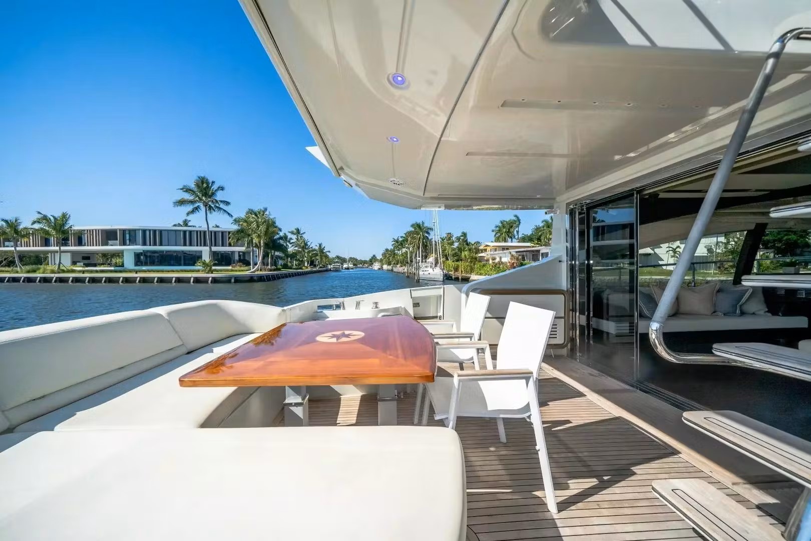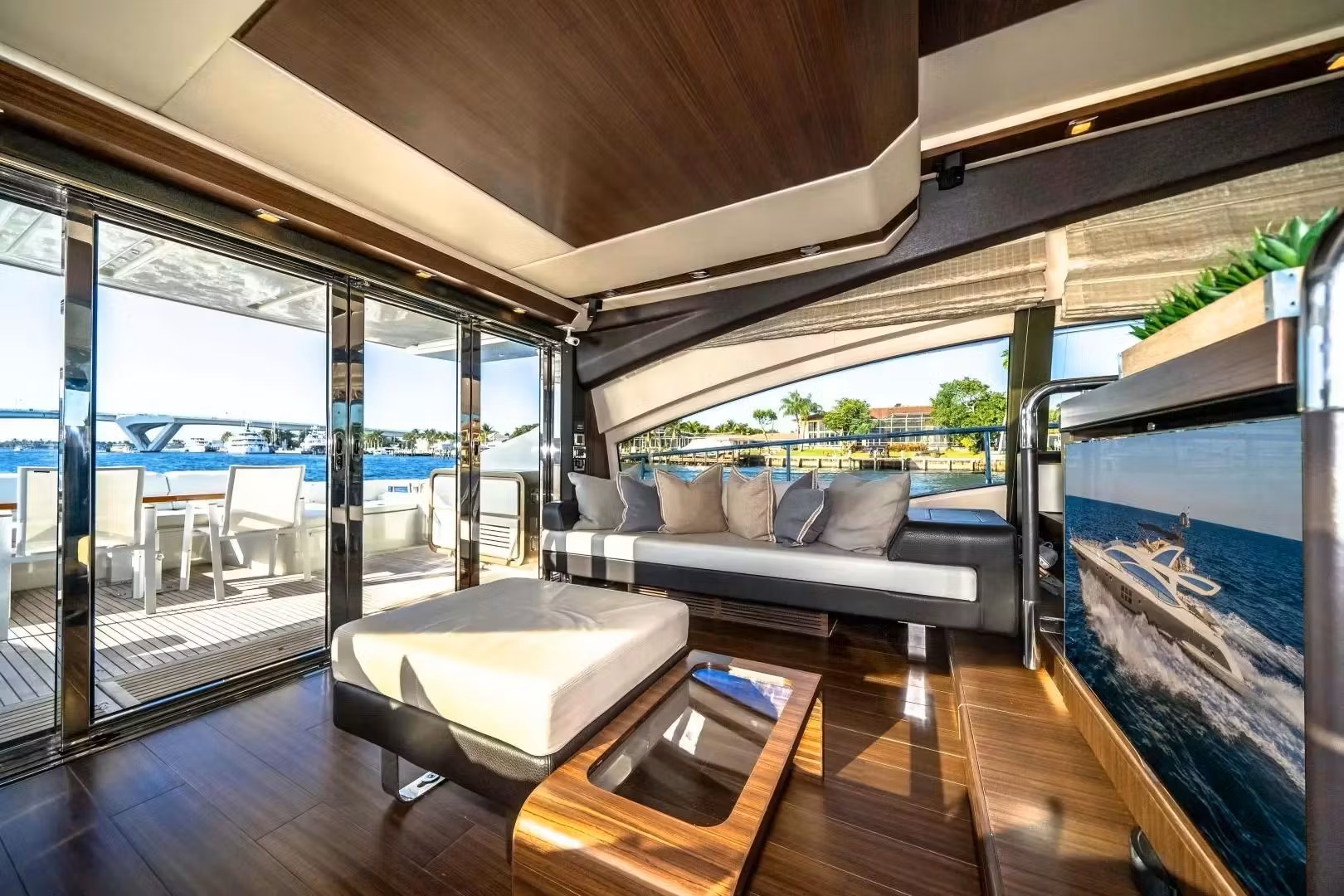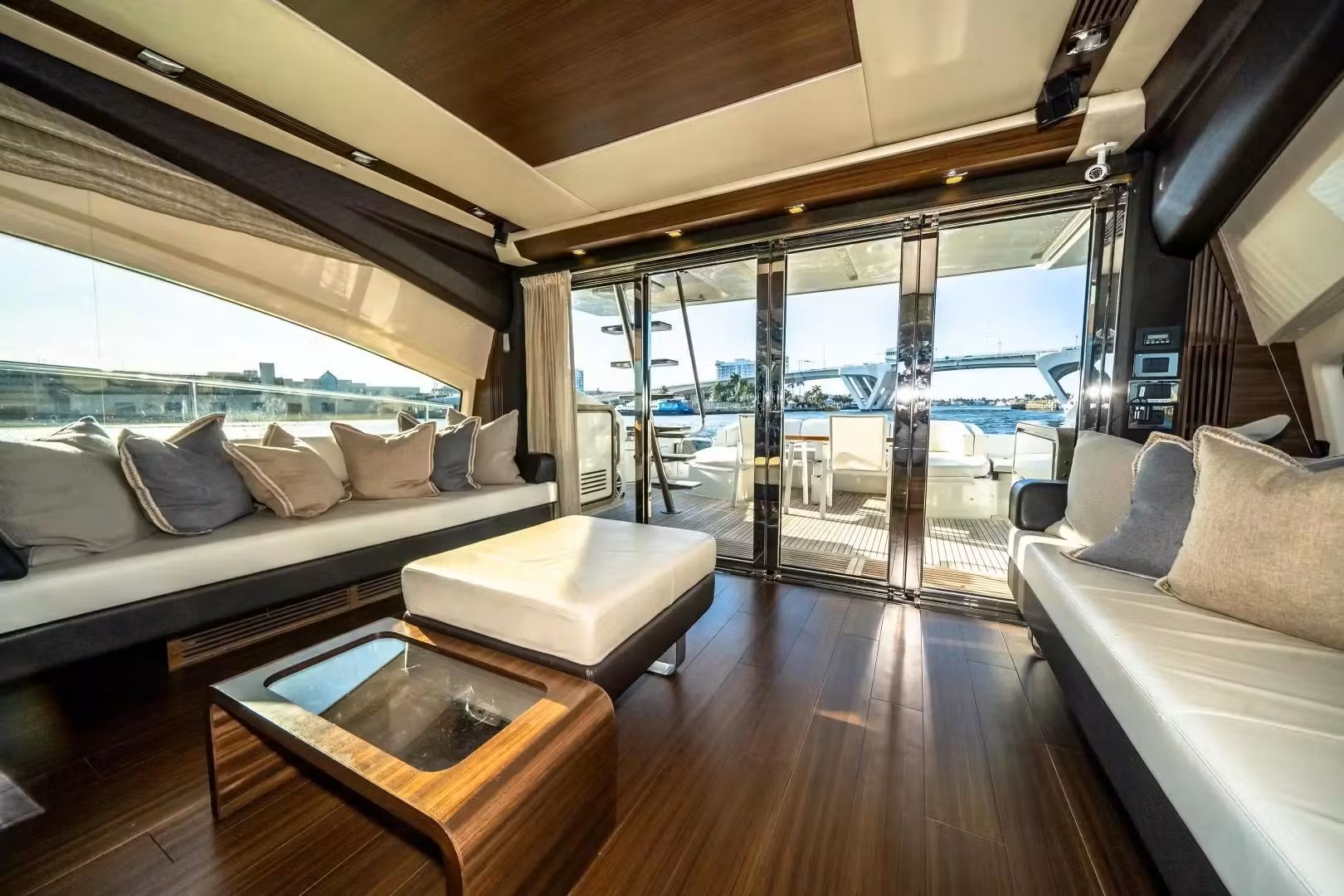 The interior of the luxurious yacht Azimut 72' includes a minimal main salon and abundant entertaining space and seating.