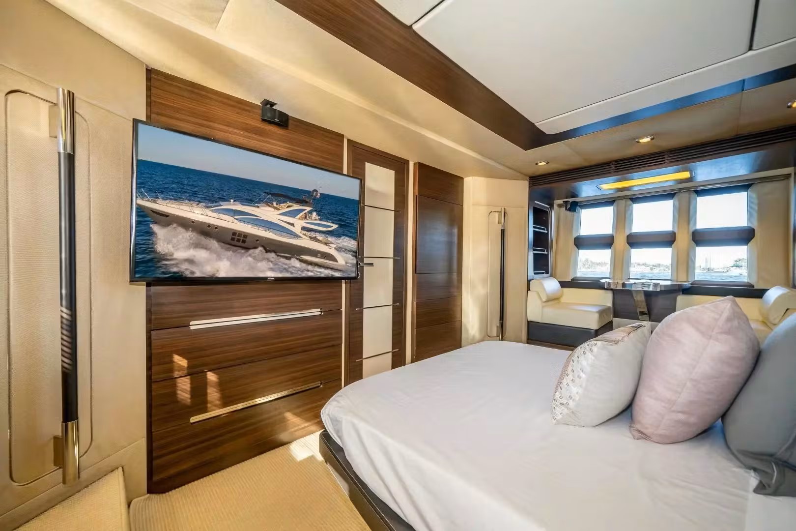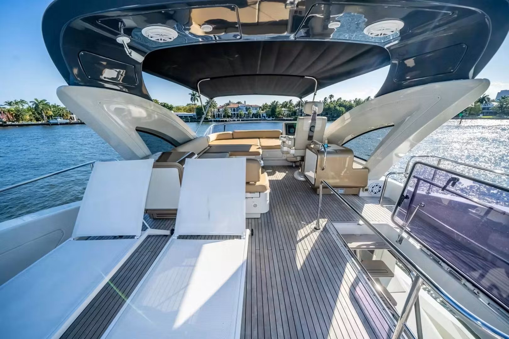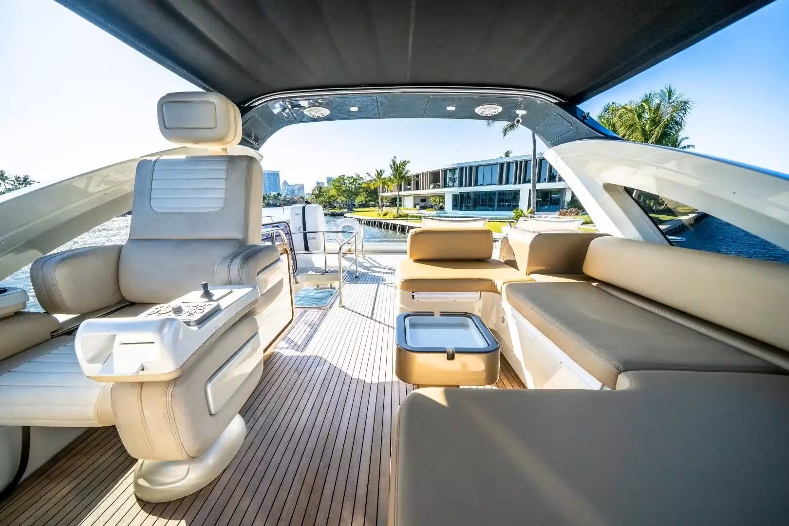 The interior of the luxurious yacht Azimut 72' includes a minimal main salon and abundant entertaining space and seating.