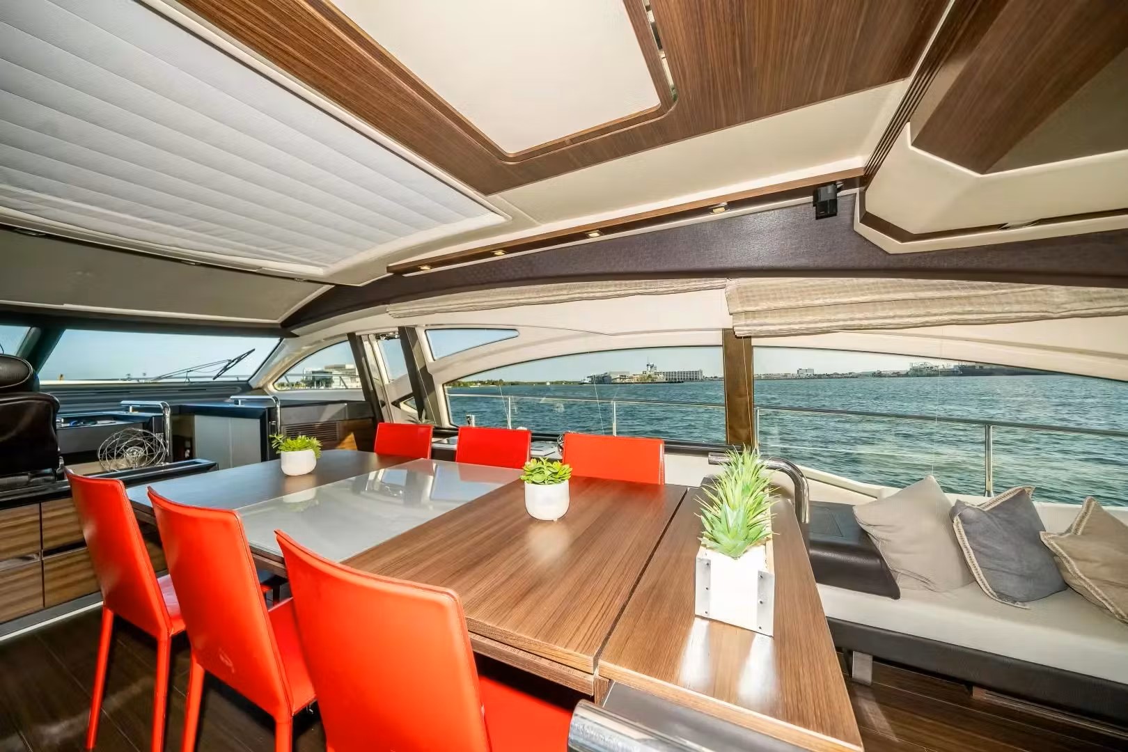 The interior of the luxurious yacht Azimut 72' includes a minimal main salon and abundant entertaining space and seating.